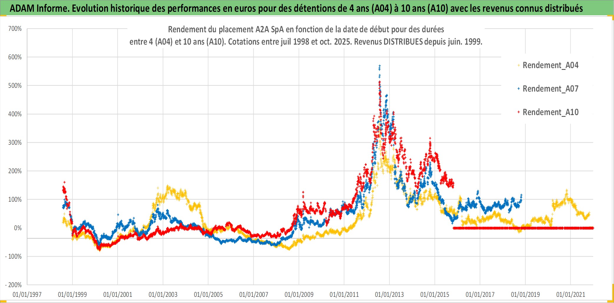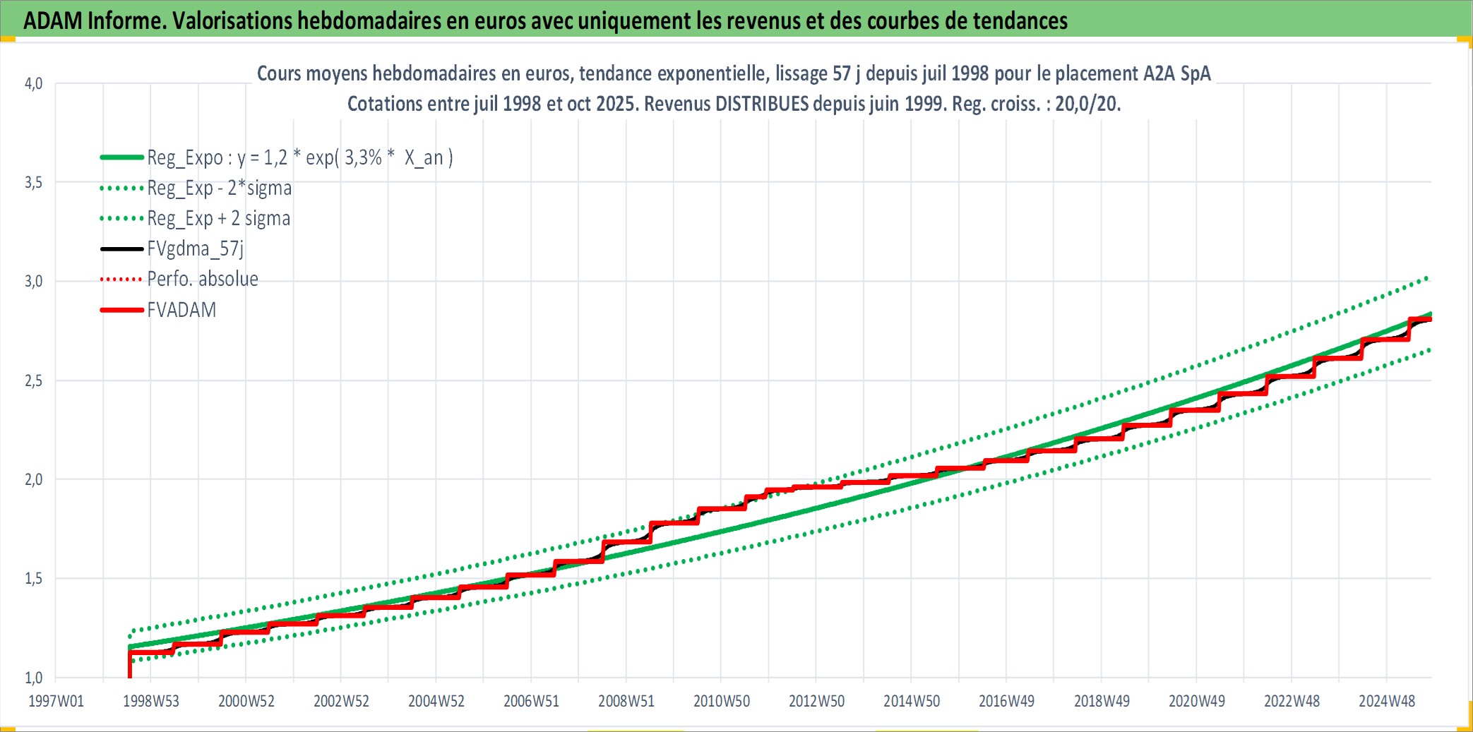 Site dédié aux investisseursPage dédiée sur site financeAnalyse des valorisations hebdomadaires de l'action A2A SpA. Cet actif est cote en EUR. Les valorisations couvrent les semaines 1998W30 a 2025W44. Les revenus de cet actif financier sont pris en compte depuis la semaine 1999W25. La note ESG de cet actif n'est pas connue.