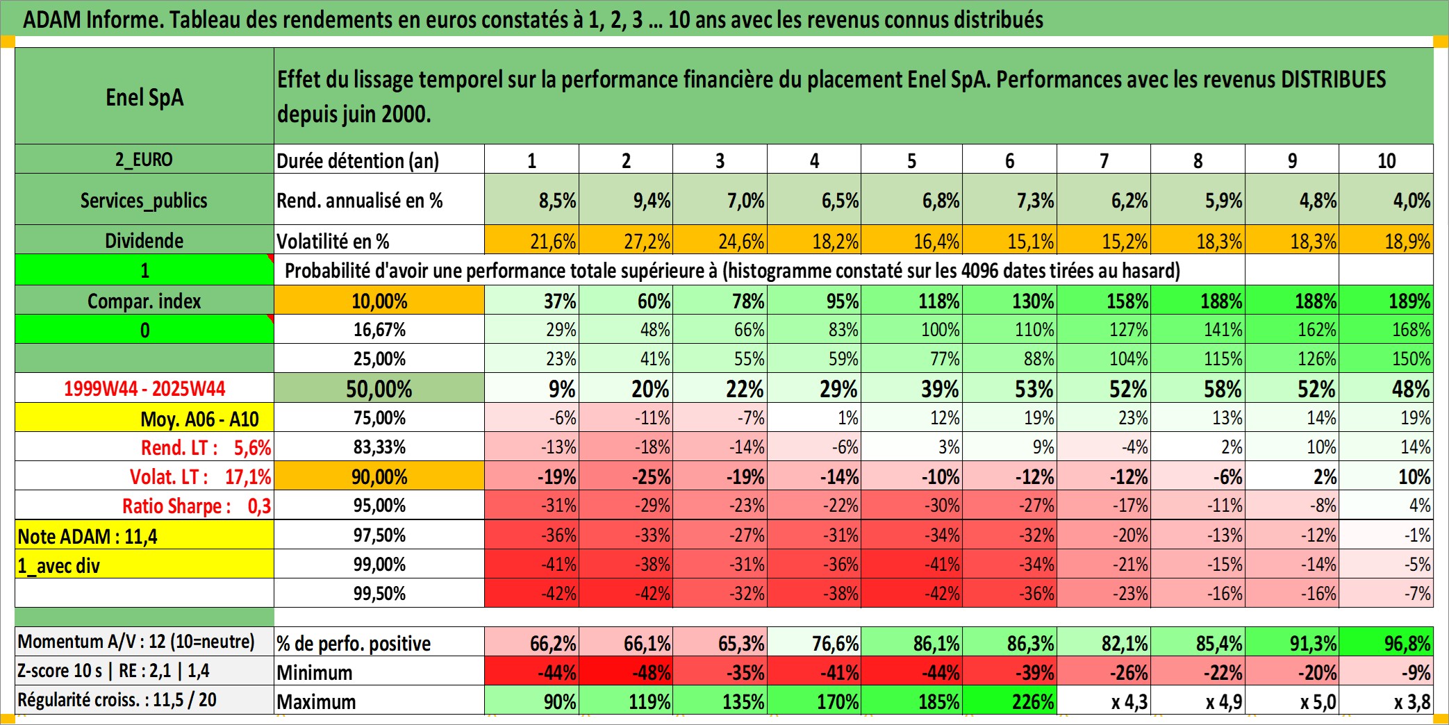 Site dédié aux investisseursPage dédiée sur site financeAnalyse des valorisations hebdomadaires de l'action Enel SpA. Cet actif est cote en EUR. Les valorisations couvrent les semaines 1999W44 a 2025W44. Les revenus de cet actif financier sont pris en compte depuis la semaine 2000W25. La note globale ESG de cet actif est estimee a 9.0 (apres rebasage entre 0 et 20).