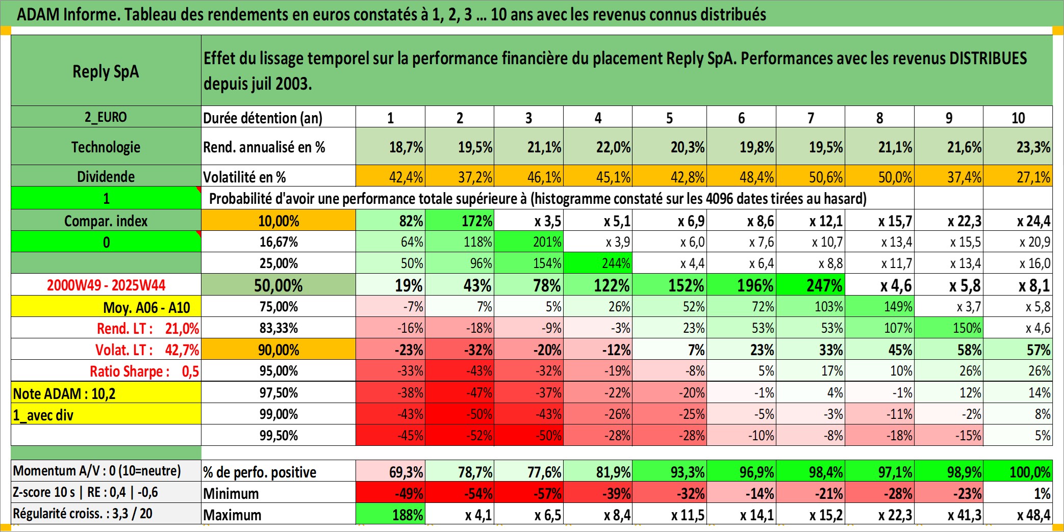 Site dédié aux investisseursPage dédiée sur site financeAnalyse des valorisations hebdomadaires de l'action Reply SpA. Cet actif est cote en EUR. Les valorisations couvrent les semaines 2000W49 a 2025W44. Les revenus de cet actif financier sont pris en compte depuis la semaine 2003W28. La note ESG de cet actif n'est pas connue.