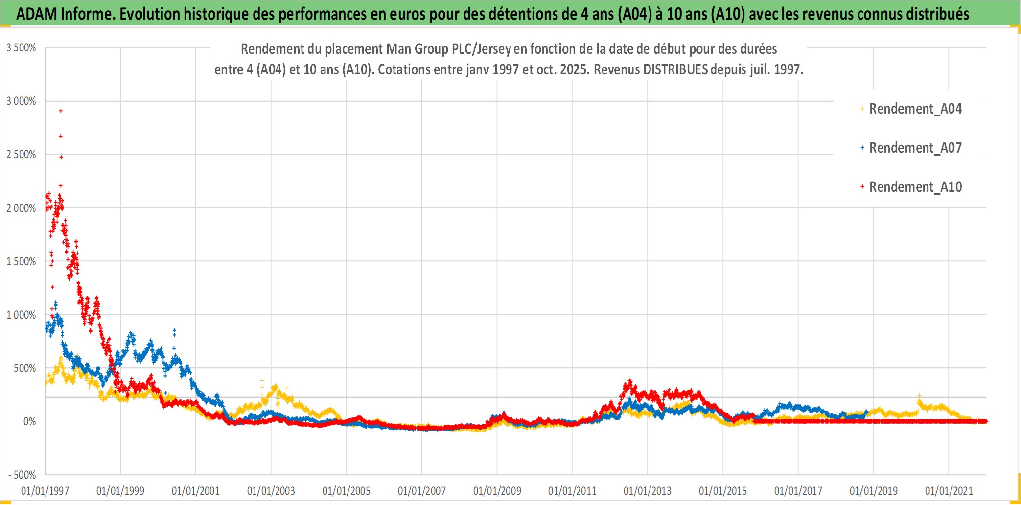 Site dédié aux investisseursPage dédiée sur site financeAnalyse des valorisations hebdomadaires de l'action Man Group PLC/Jersey. Cet actif est cote en GBX. Les valorisations sont en contrevaleur EURO et couvrent les semaines 1997W01 a 2025W44. Les revenus de cet actif financier sont pris en compte depuis la semaine 1997W29. La note ESG de cet actif n'est pas connue.