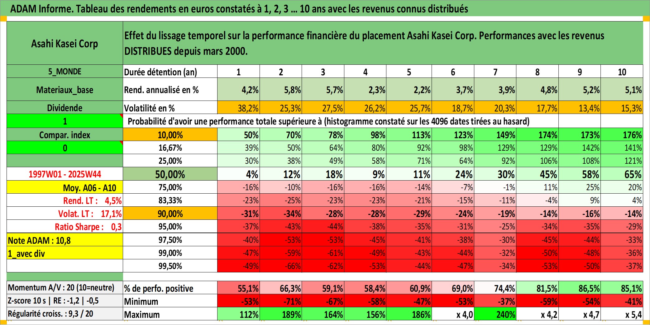 Site dédié aux investisseursPage dédiée sur site financeAnalyse des valorisations hebdomadaires de l'action Asahi Kasei Corp. Cet actif est cote en JPY. Les valorisations sont en contrevaleur EURO et couvrent les semaines 1997W01 a 2025W44. Les revenus de cet actif financier sont pris en compte depuis la semaine 2000W13. La note globale ESG de cet actif est estimee a 7.0 (apres rebasage entre 0 et 20).