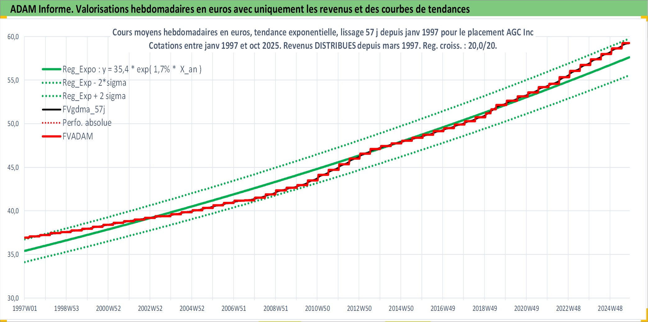 Site dédié aux investisseursPage dédiée sur site financeAnalyse des valorisations hebdomadaires de l'action AGC Inc. Cet actif est cote en JPY. Les valorisations sont en contrevaleur EURO et couvrent les semaines 1997W01 a 2025W44. Les revenus de cet actif financier sont pris en compte depuis la semaine 1997W13. La note globale ESG de cet actif est estimee a 9.0 (apres rebasage entre 0 et 20).