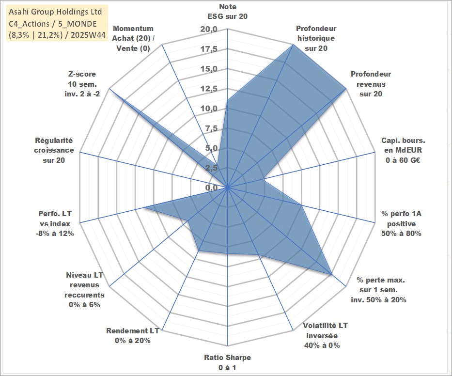 Site dédié aux investisseursPage dédiée sur site financeAnalyse des valorisations hebdomadaires de l'action Asahi Group Holdings Ltd. Cet actif est cote en JPY. Les valorisations sont en contrevaleur EURO et couvrent les semaines 1997W01 a 2025W44. Les revenus de cet actif financier sont pris en compte depuis la semaine 1997W26. La note globale ESG de cet actif est estimee a 11.0 (apres rebasage entre 0 et 20).