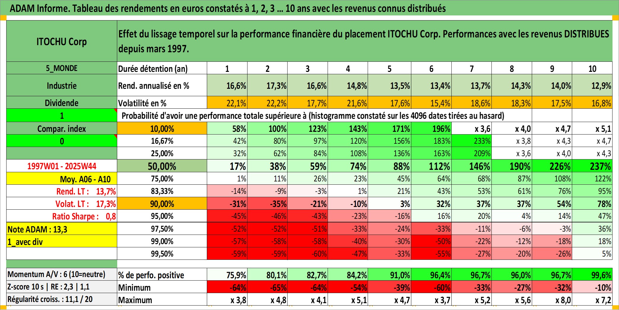Site dédié aux investisseursPage dédiée sur site financeAnalyse des valorisations hebdomadaires de l'action ITOCHU Corp. Cet actif est cote en JPY. Les valorisations sont en contrevaleur EURO et couvrent les semaines 1997W01 a 2025W44. Les revenus de cet actif financier sont pris en compte depuis la semaine 1997W13. La note globale ESG de cet actif est estimee a 10.0 (apres rebasage entre 0 et 20).