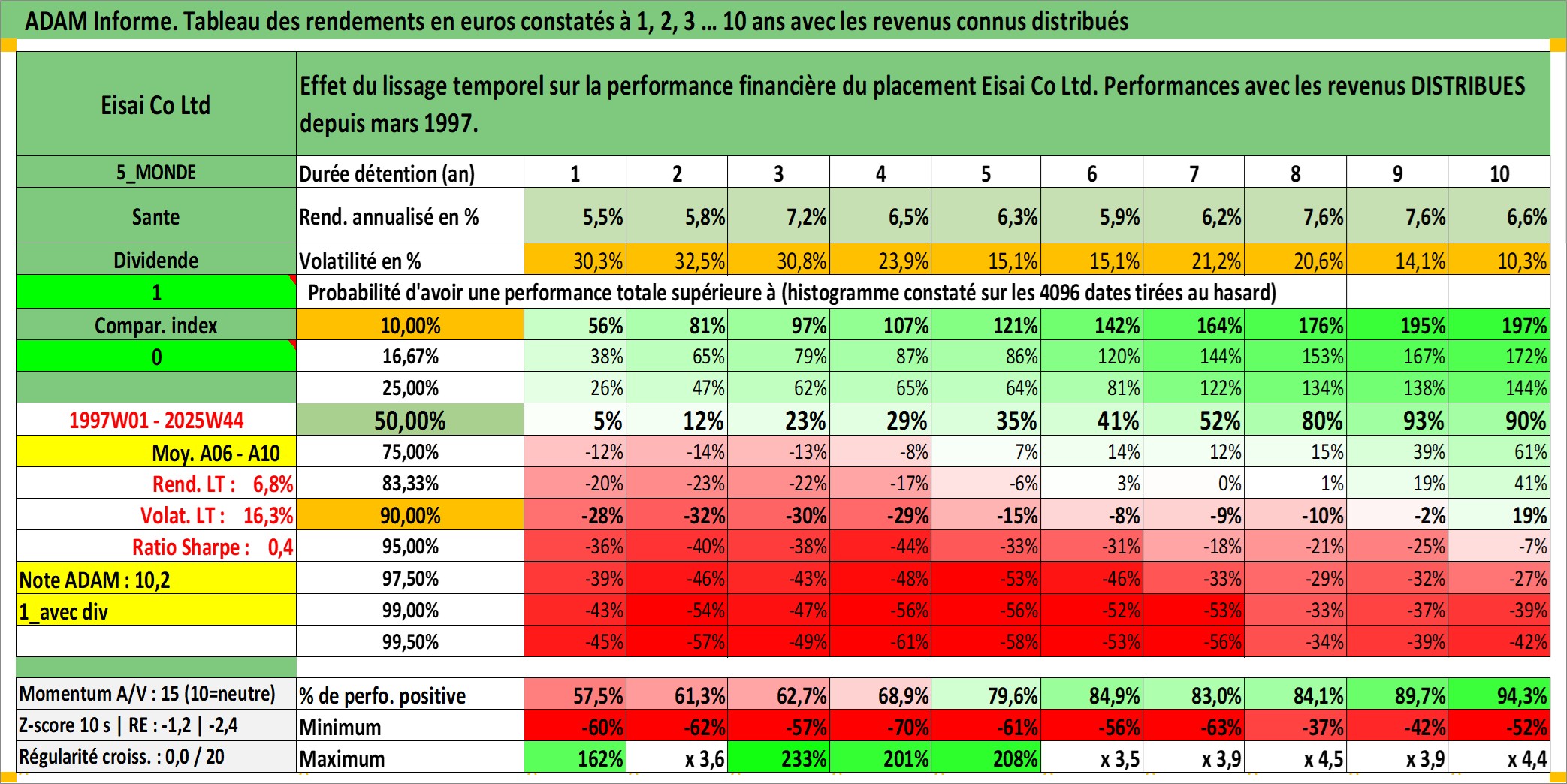 Site dédié aux investisseursPage dédiée sur site financeAnalyse des valorisations hebdomadaires de l'action Eisai Co Ltd. Cet actif est cote en JPY. Les valorisations sont en contrevaleur EURO et couvrent les semaines 1997W01 a 2025W44. Les revenus de cet actif financier sont pris en compte depuis la semaine 1997W13. La note globale ESG de cet actif est estimee a 7.0 (apres rebasage entre 0 et 20).