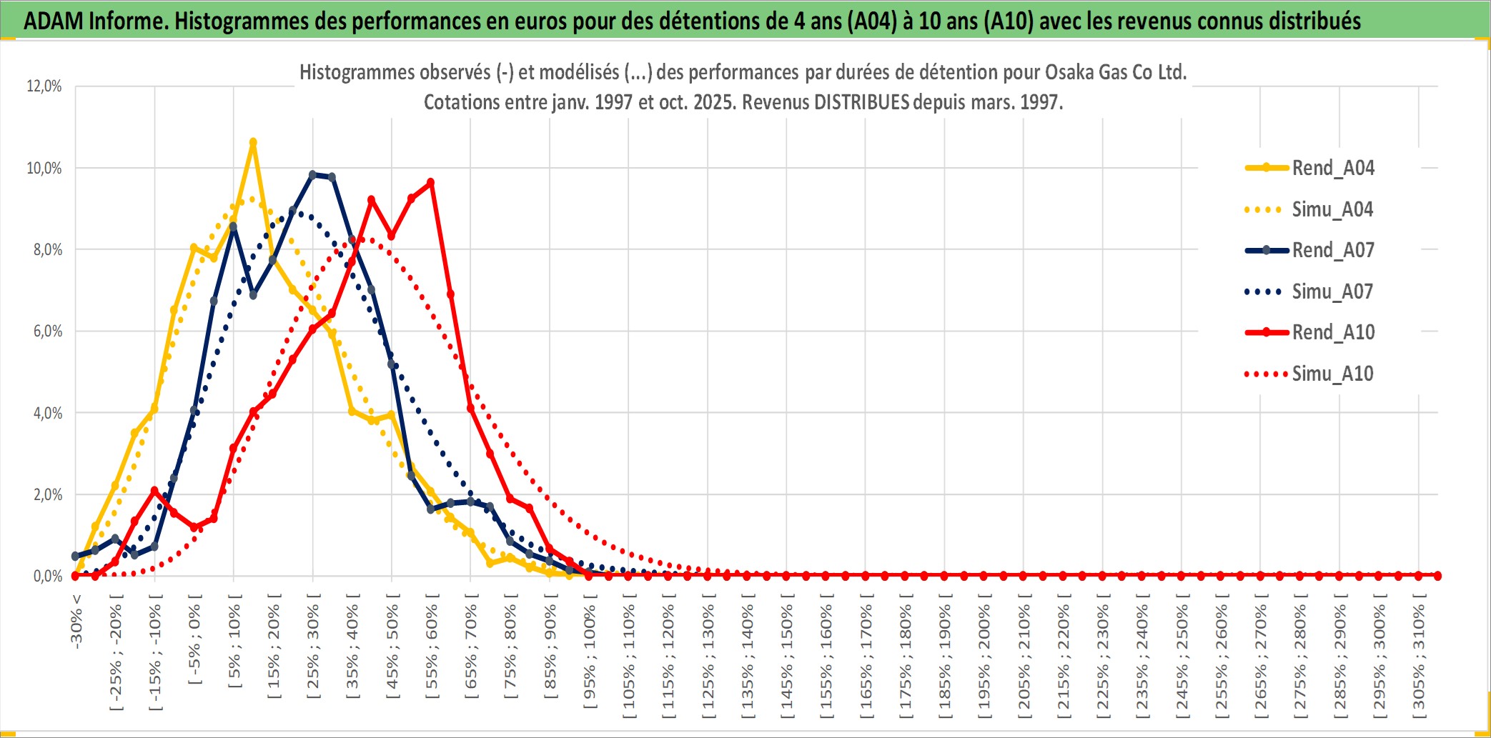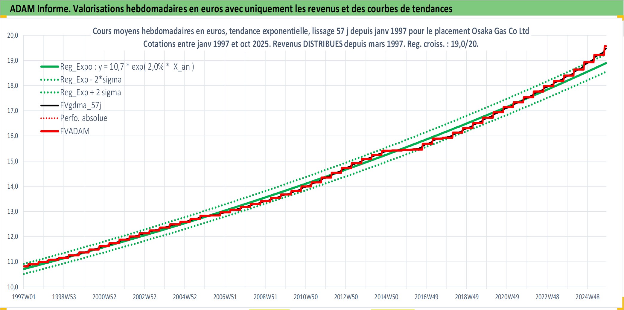 Site dédié aux investisseursPage dédiée sur site financeAnalyse des valorisations hebdomadaires de l'action Osaka Gas Co Ltd. Cet actif est cote en JPY. Les valorisations sont en contrevaleur EURO et couvrent les semaines 1997W01 a 2025W44. Les revenus de cet actif financier sont pris en compte depuis la semaine 1997W13. La note globale ESG de cet actif est estimee a 2.0 (apres rebasage entre 0 et 20).