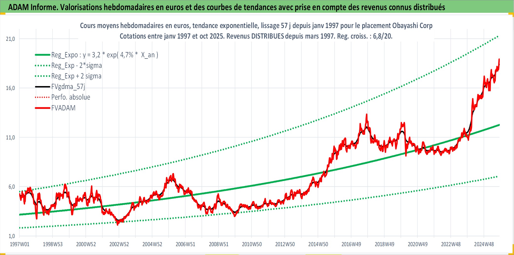 Site dédié aux investisseursPage dédiée sur site financeAnalyse des valorisations hebdomadaires de l'action Obayashi Corp. Cet actif est cote en JPY. Les valorisations sont en contrevaleur EURO et couvrent les semaines 1997W01 a 2025W44. Les revenus de cet actif financier sont pris en compte depuis la semaine 1997W13. La note globale ESG de cet actif est estimee a 6.0 (apres rebasage entre 0 et 20).