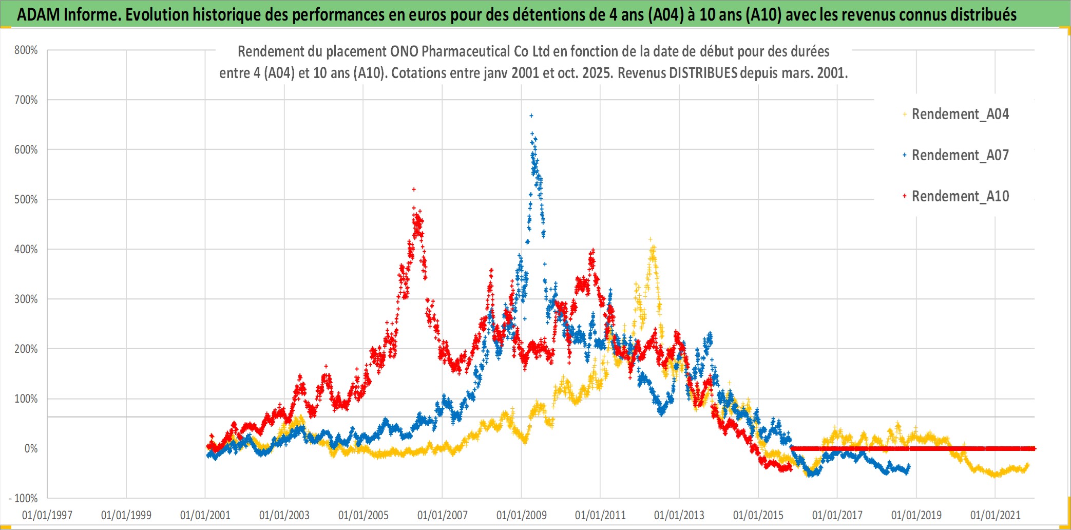 Site dédié aux investisseursPage dédiée sur site financeAnalyse des valorisations hebdomadaires de l'action ONO Pharmaceutical Co Ltd. Cet actif est cote en JPY. Les valorisations sont en contrevaleur EURO et couvrent les semaines 2001W02 a 2025W44. Les revenus de cet actif financier sont pris en compte depuis la semaine 2001W13. La note globale ESG de cet actif est estimee a 7.0 (apres rebasage entre 0 et 20).