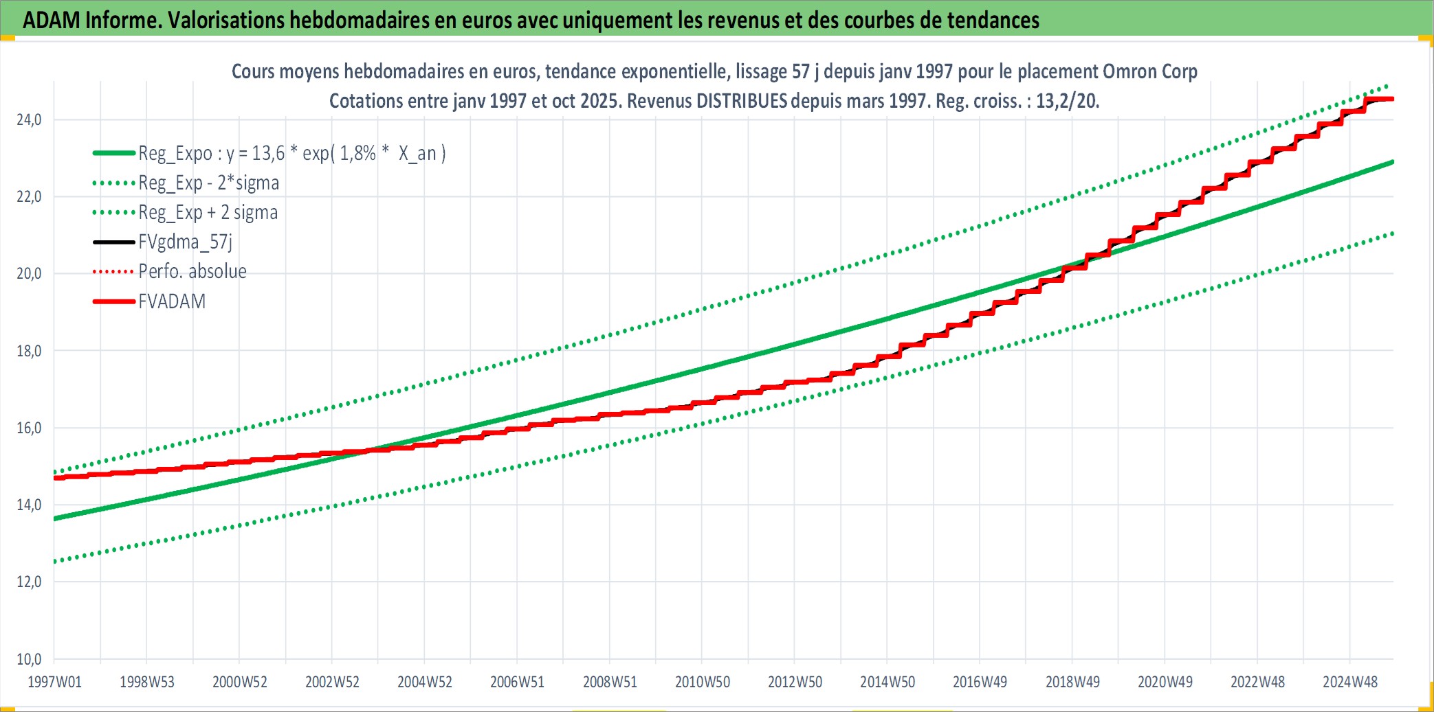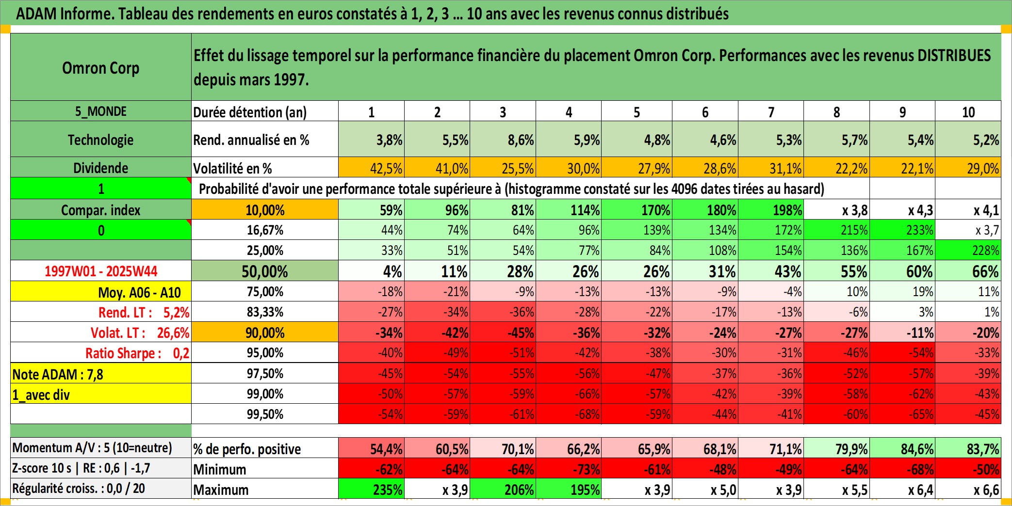 Site dédié aux investisseursPage dédiée sur site financeAnalyse des valorisations hebdomadaires de l'action Omron Corp. Cet actif est cote en JPY. Les valorisations sont en contrevaleur EURO et couvrent les semaines 1997W01 a 2025W44. Les revenus de cet actif financier sont pris en compte depuis la semaine 1997W13. La note globale ESG de cet actif est estimee a 12.0 (apres rebasage entre 0 et 20).