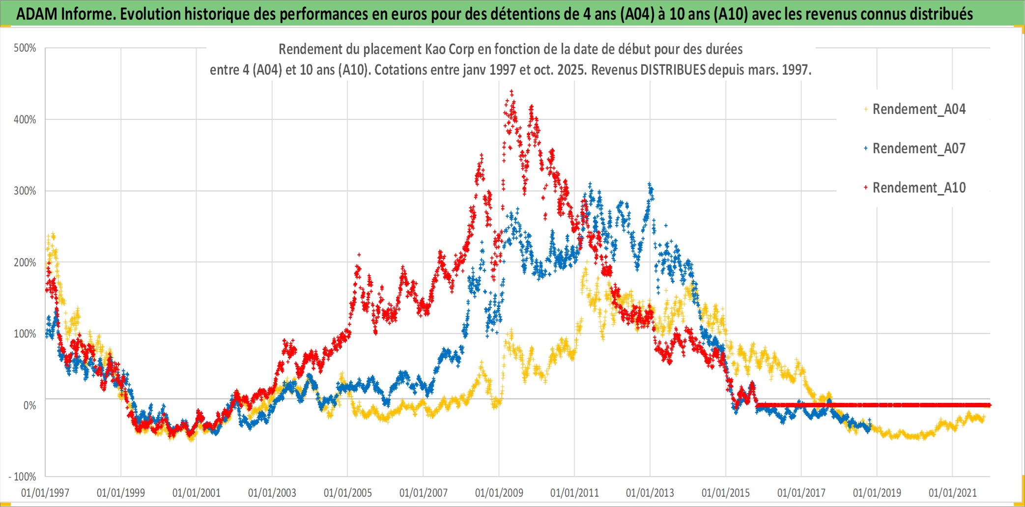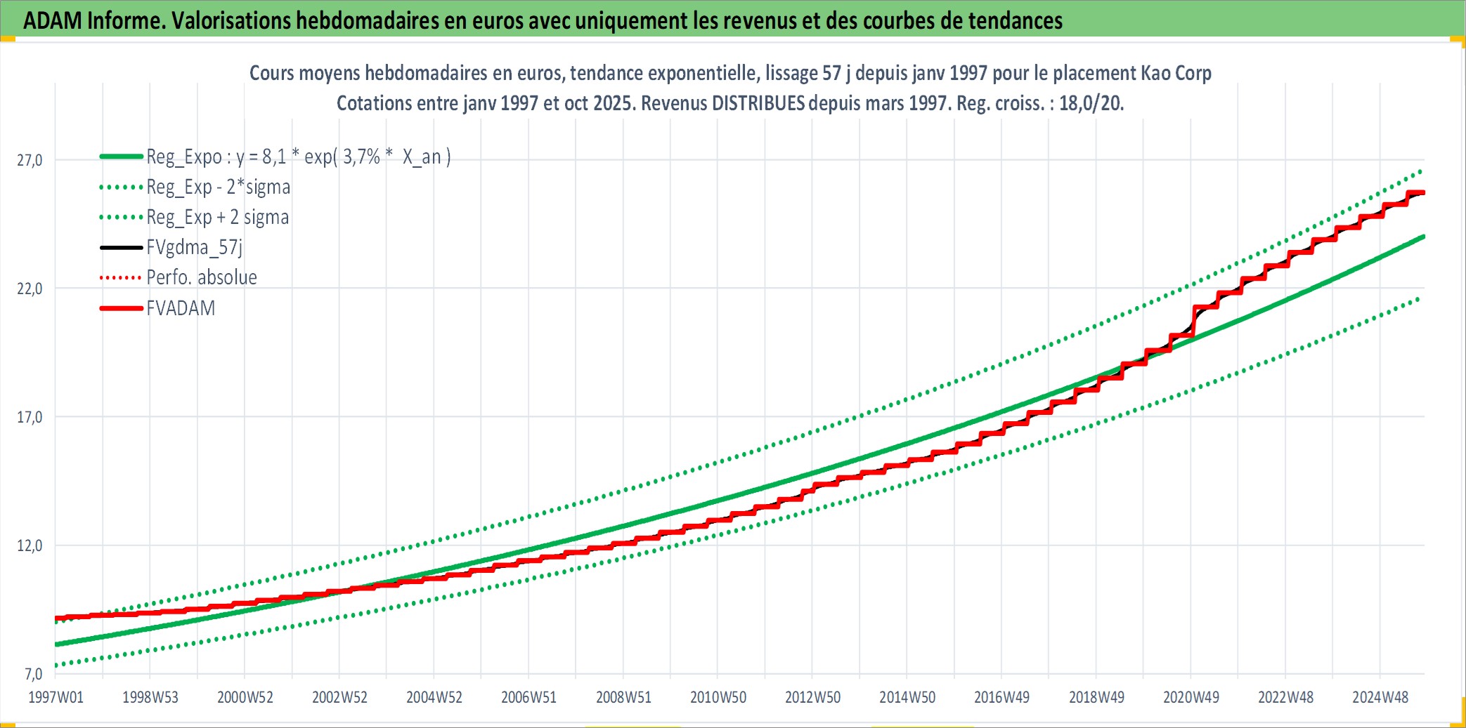Site dédié aux investisseursPage dédiée sur site financeAnalyse des valorisations hebdomadaires de l'action Kao Corp. Cet actif est cote en JPY. Les valorisations sont en contrevaleur EURO et couvrent les semaines 1997W01 a 2025W44. Les revenus de cet actif financier sont pris en compte depuis la semaine 1997W13. La note globale ESG de cet actif est estimee a 12.0 (apres rebasage entre 0 et 20).