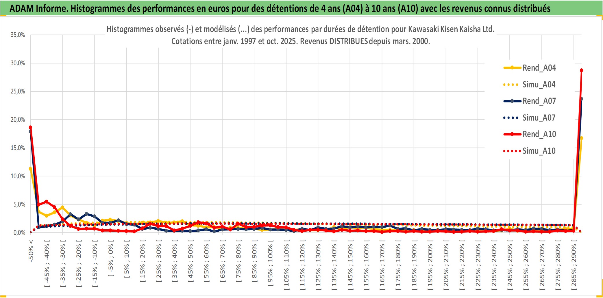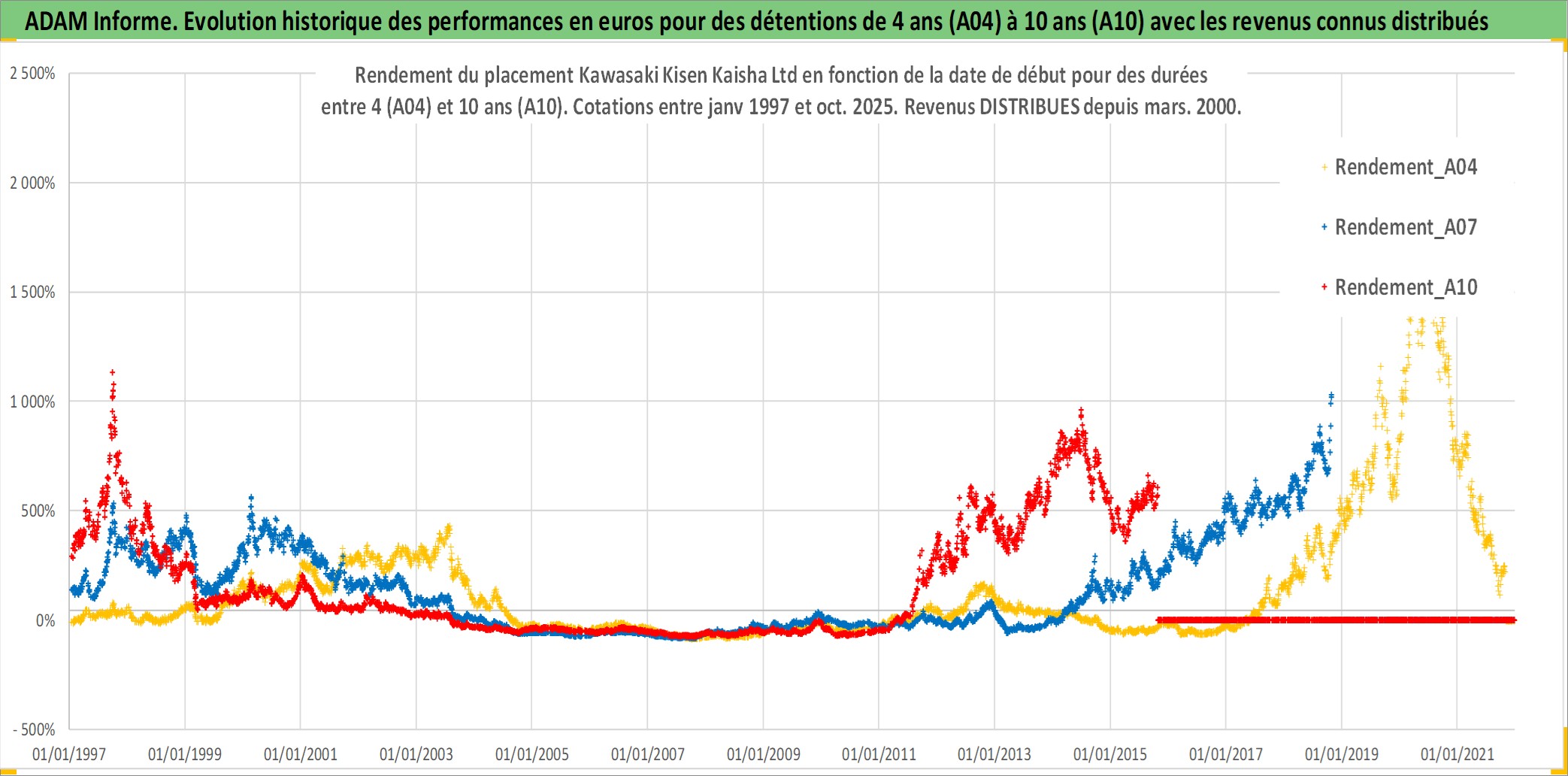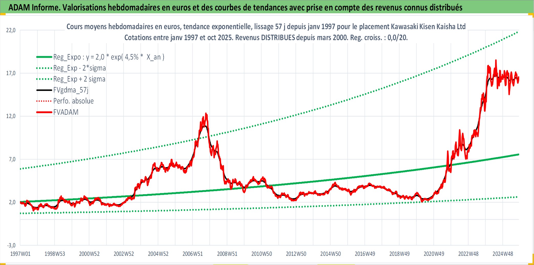 Site dédié aux investisseursPage dédiée sur site financeAnalyse des valorisations hebdomadaires de l'action Kawasaki Kisen Kaisha Ltd. Cet actif est cote en JPY. Les valorisations sont en contrevaleur EURO et couvrent les semaines 1997W01 a 2025W44. Les revenus de cet actif financier sont pris en compte depuis la semaine 2000W13. La note ESG de cet actif n'est pas connue.