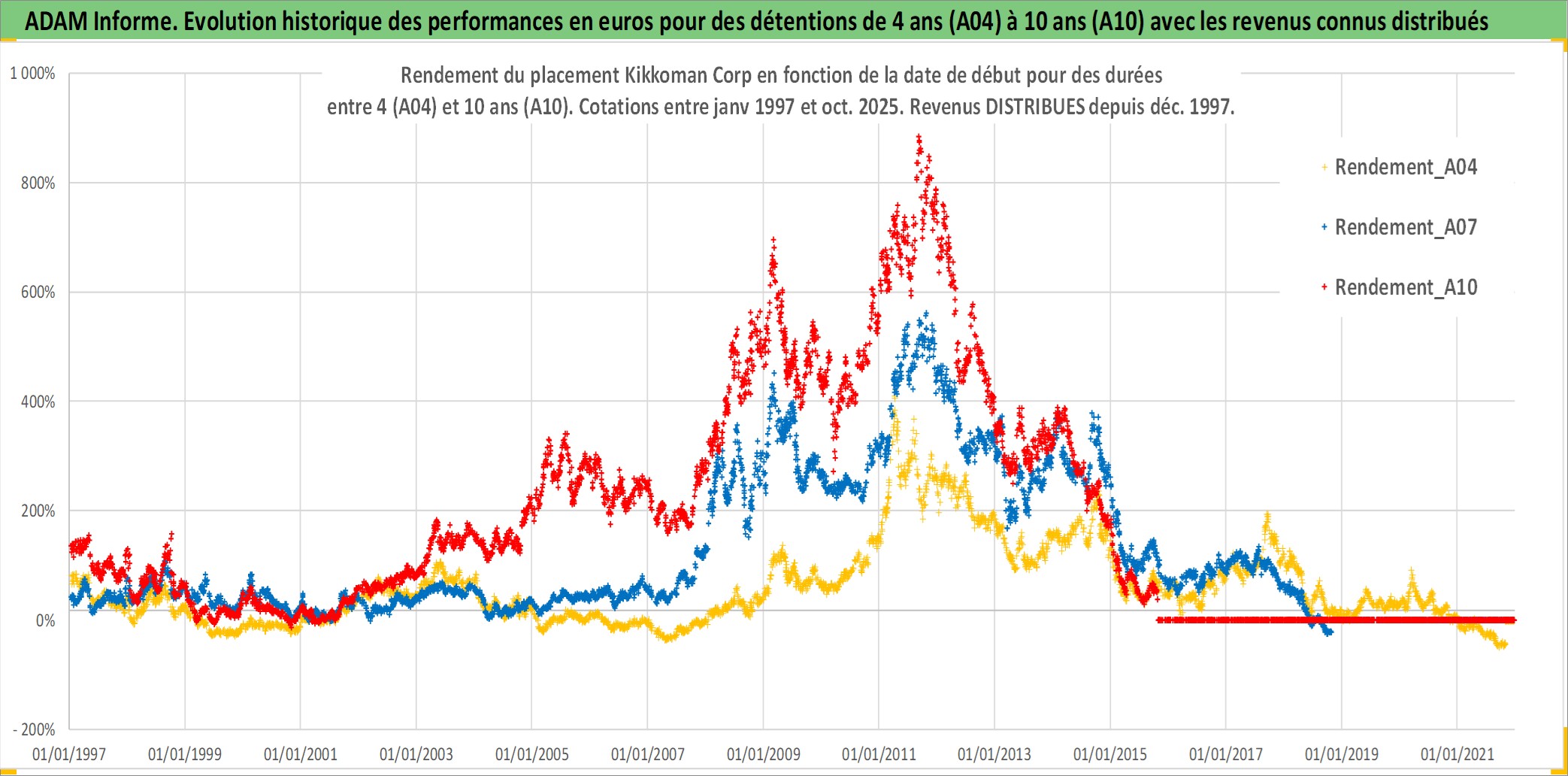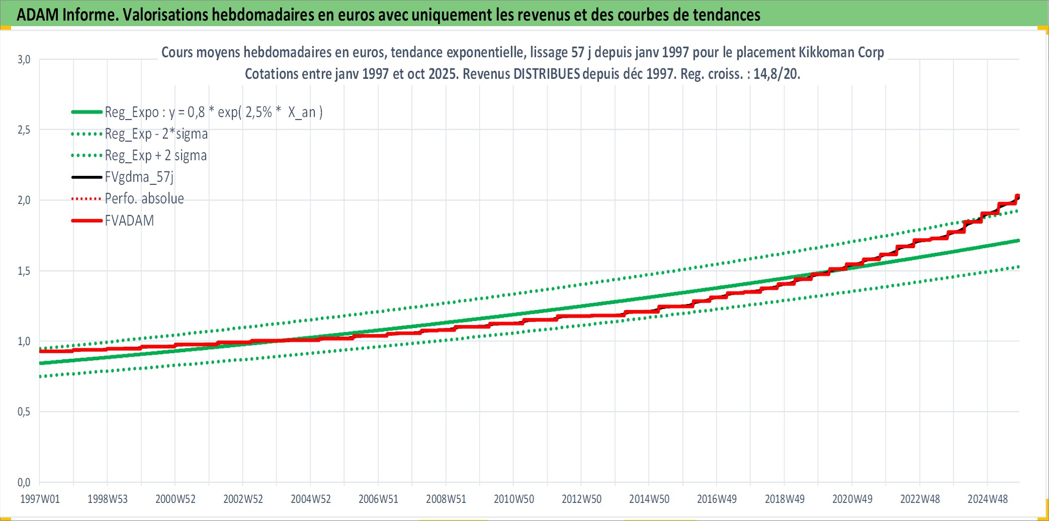 Site dédié aux investisseursPage dédiée sur site financeAnalyse des valorisations hebdomadaires de l'action Kikkoman Corp. Cet actif est cote en JPY. Les valorisations sont en contrevaleur EURO et couvrent les semaines 1997W01 a 2025W44. Les revenus de cet actif financier sont pris en compte depuis la semaine 1997W52. La note globale ESG de cet actif est estimee a 3.0 (apres rebasage entre 0 et 20).