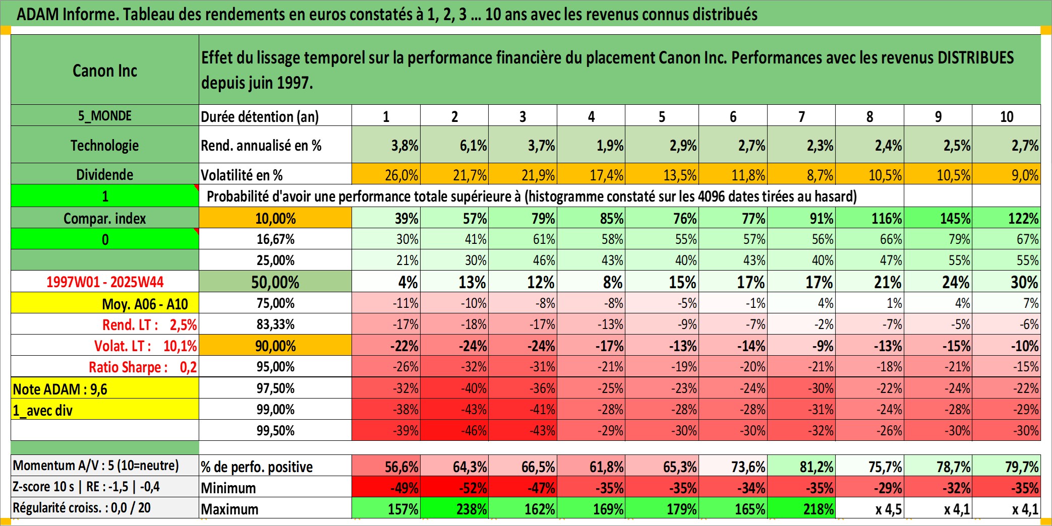 Site dédié aux investisseursPage dédiée sur site financeAnalyse des valorisations hebdomadaires de l'action Canon Inc. Cet actif est cote en JPY. Les valorisations sont en contrevaleur EURO et couvrent les semaines 1997W01 a 2025W44. Les revenus de cet actif financier sont pris en compte depuis la semaine 1997W26. La note globale ESG de cet actif est estimee a 12.0 (apres rebasage entre 0 et 20).