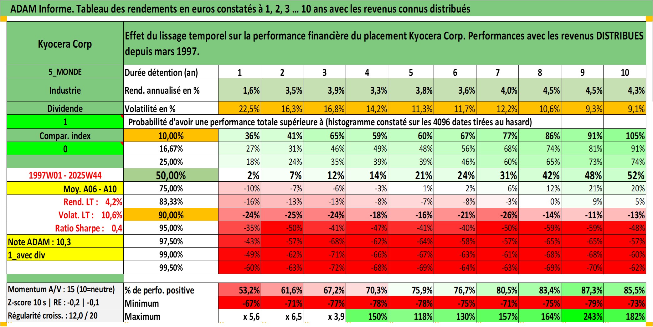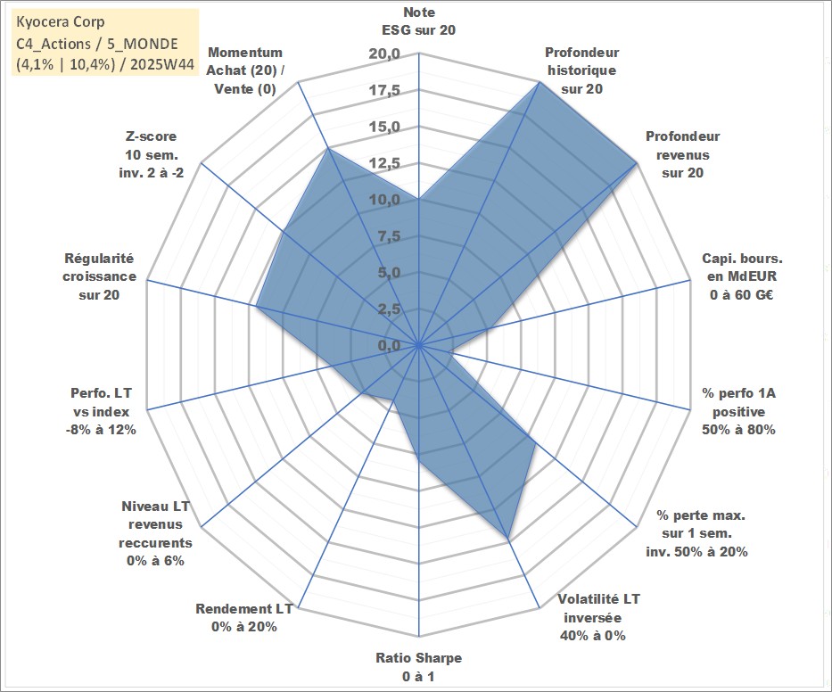 Site dédié aux investisseursPage dédiée sur site financeAnalyse des valorisations hebdomadaires de l'action Kyocera Corp. Cet actif est cote en JPY. Les valorisations sont en contrevaleur EURO et couvrent les semaines 1997W01 a 2025W44. Les revenus de cet actif financier sont pris en compte depuis la semaine 1997W13. La note globale ESG de cet actif est estimee a 10.0 (apres rebasage entre 0 et 20).