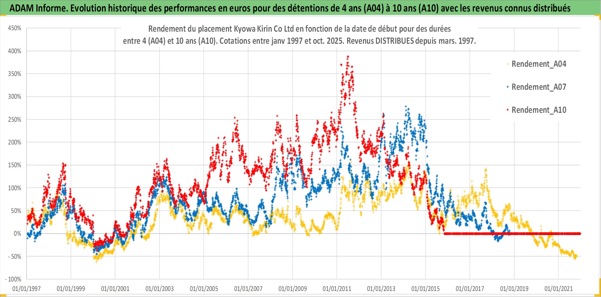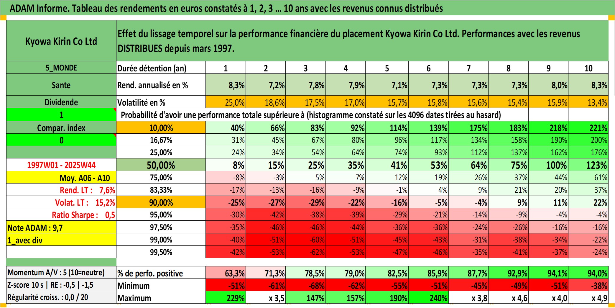 Site dédié aux investisseursPage dédiée sur site financeAnalyse des valorisations hebdomadaires de l'action Kyowa Kirin Co Ltd. Cet actif est cote en JPY. Les valorisations sont en contrevaleur EURO et couvrent les semaines 1997W01 a 2025W44. Les revenus de cet actif financier sont pris en compte depuis la semaine 1997W13. La note globale ESG de cet actif est estimee a 8.0 (apres rebasage entre 0 et 20).