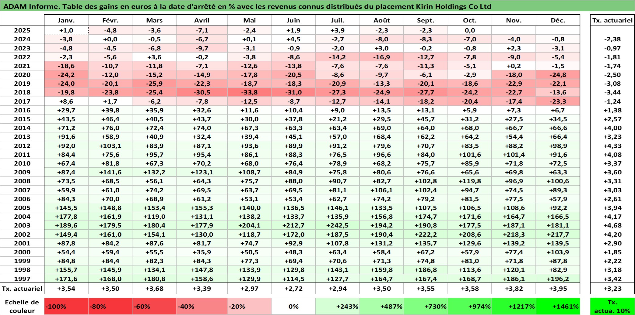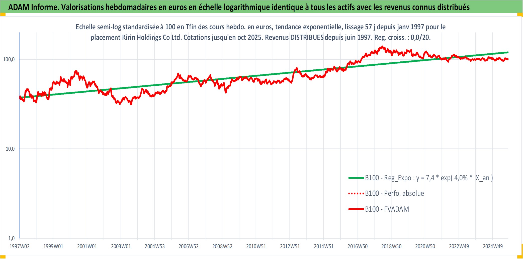 Site dédié aux investisseursPage dédiée sur site financeAnalyse des valorisations hebdomadaires de l'action Kirin Holdings Co Ltd. Cet actif est cote en JPY. Les valorisations sont en contrevaleur EURO et couvrent les semaines 1997W01 a 2025W44. Les revenus de cet actif financier sont pris en compte depuis la semaine 1997W26. La note globale ESG de cet actif est estimee a 10.0 (apres rebasage entre 0 et 20).
