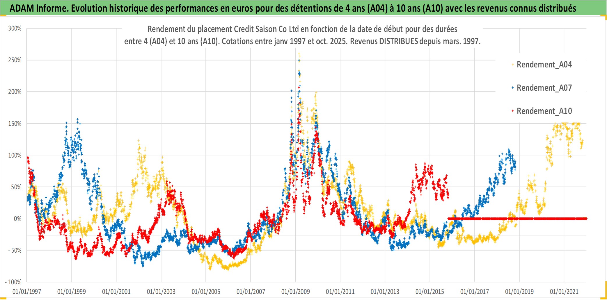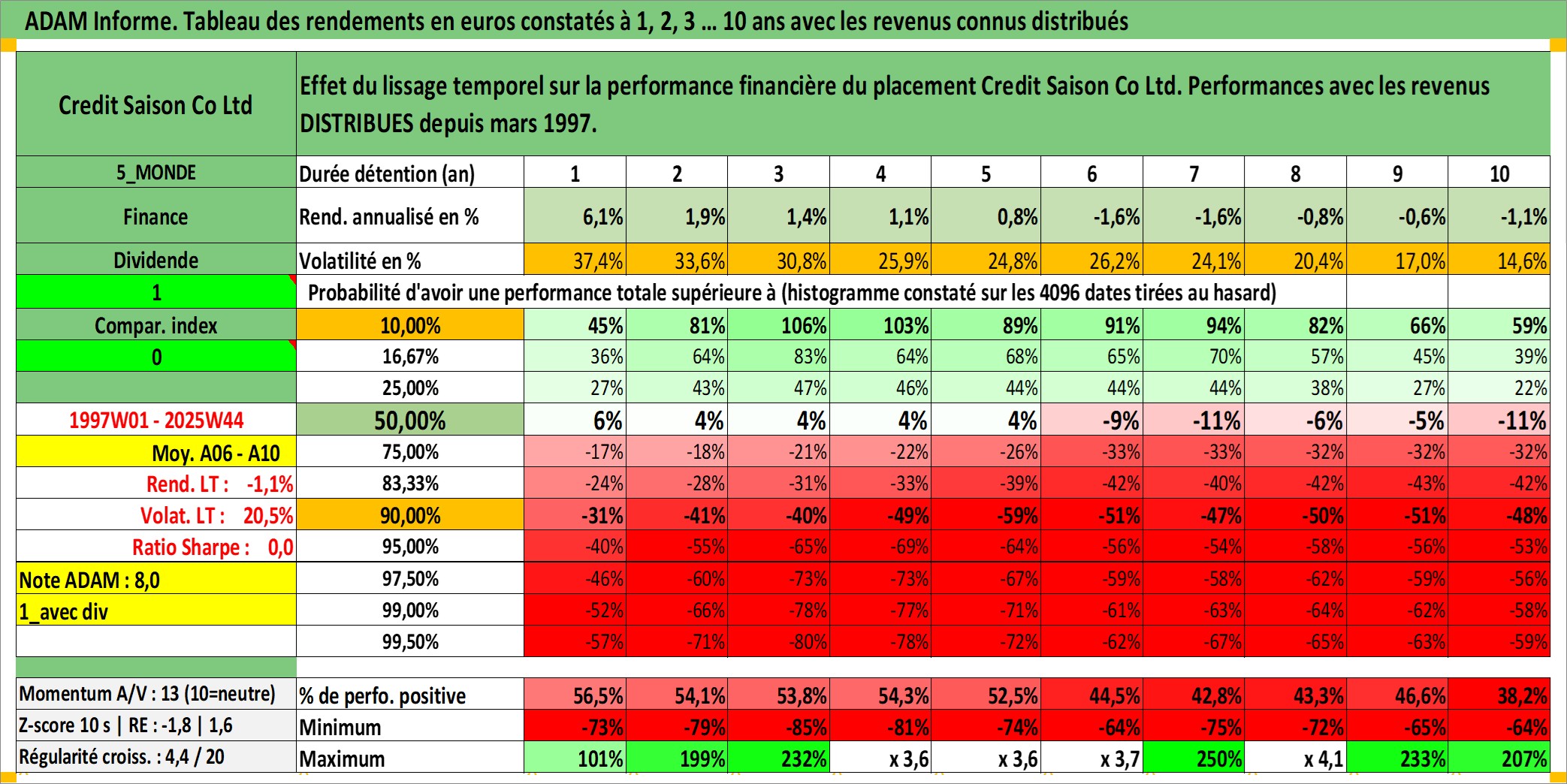Site dédié aux investisseursPage dédiée sur site financeAnalyse des valorisations hebdomadaires de l'action Credit Saison Co Ltd. Cet actif est cote en JPY. Les valorisations sont en contrevaleur EURO et couvrent les semaines 1997W01 a 2025W44. Les revenus de cet actif financier sont pris en compte depuis la semaine 1997W13. La note ESG de cet actif n'est pas connue.