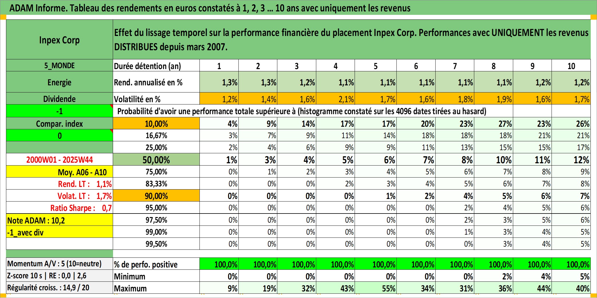 Site dédié aux investisseursPage dédiée sur site financeAnalyse des valorisations hebdomadaires de l'action Inpex Corp. Cet actif est cote en JPY. Les valorisations sont en contrevaleur EURO et couvrent les semaines 2000W01 a 2025W44. Les revenus de cet actif financier sont pris en compte depuis la semaine 2007W13. La note globale ESG de cet actif est estimee a 3.0 (apres rebasage entre 0 et 20).