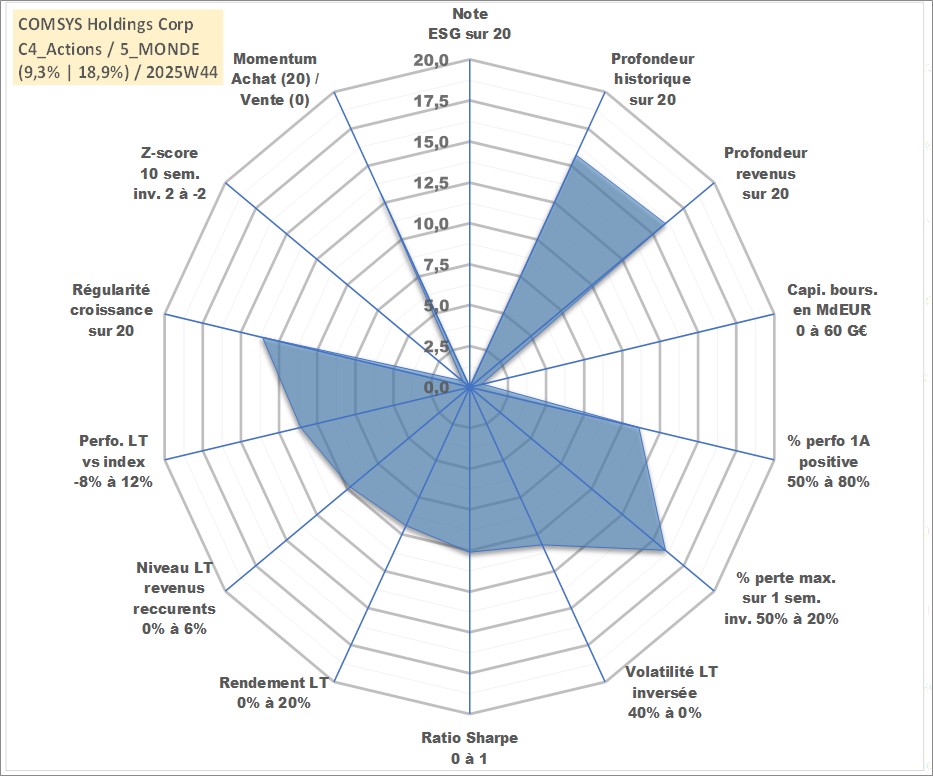 Site dédié aux investisseursPage dédiée sur site financeAnalyse des valorisations hebdomadaires de l'action COMSYS Holdings Corp. Cet actif est cote en JPY. Les valorisations sont en contrevaleur EURO et couvrent les semaines 2003W41 a 2025W44. Les revenus de cet actif financier sont pris en compte depuis la semaine 2004W13. La note ESG de cet actif n'est pas connue.