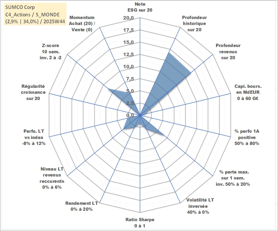 Site dédié aux investisseursPage dédiée sur site financeAnalyse des valorisations hebdomadaires de l'action SUMCO Corp. Cet actif est cote en JPY. Les valorisations sont en contrevaleur EURO et couvrent les semaines 2005W46 a 2025W44. Les revenus de cet actif financier sont pris en compte depuis la semaine 2006W30. La note ESG de cet actif n'est pas connue.