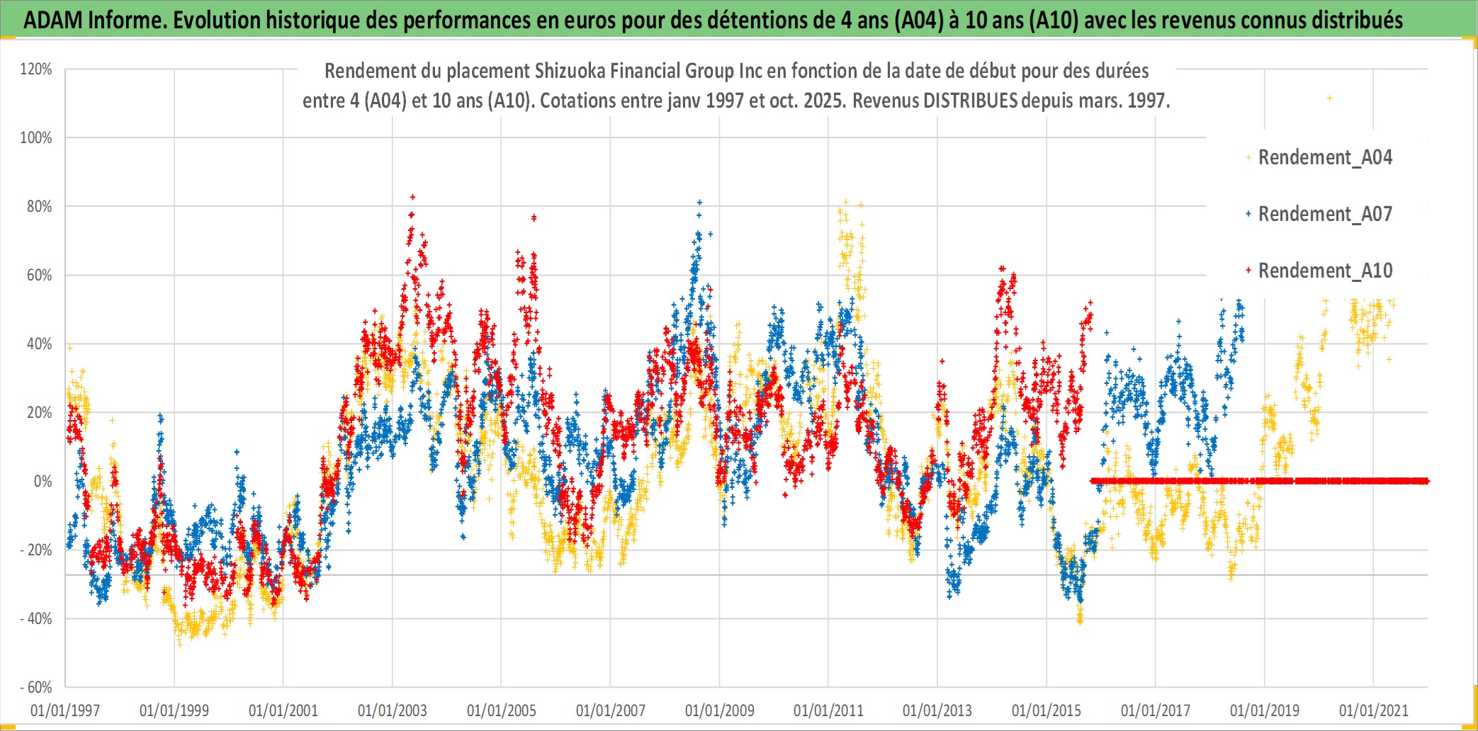 Site dédié aux investisseursPage dédiée sur site financeAnalyse des valorisations hebdomadaires de l'action Shizuoka Financial Group Inc. Cet actif est cote en JPY. Les valorisations sont en contrevaleur EURO et couvrent les semaines 1997W01 a 2025W44. Les revenus de cet actif financier sont pris en compte depuis la semaine 1997W13. La note ESG de cet actif n'est pas connue.