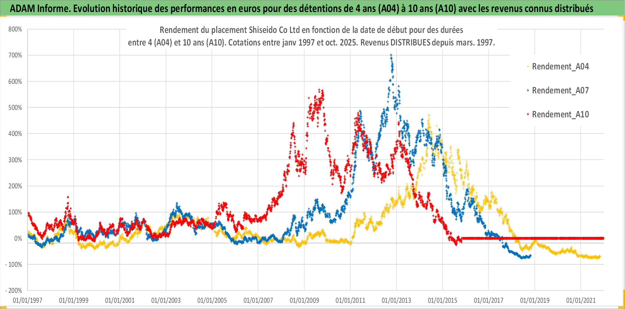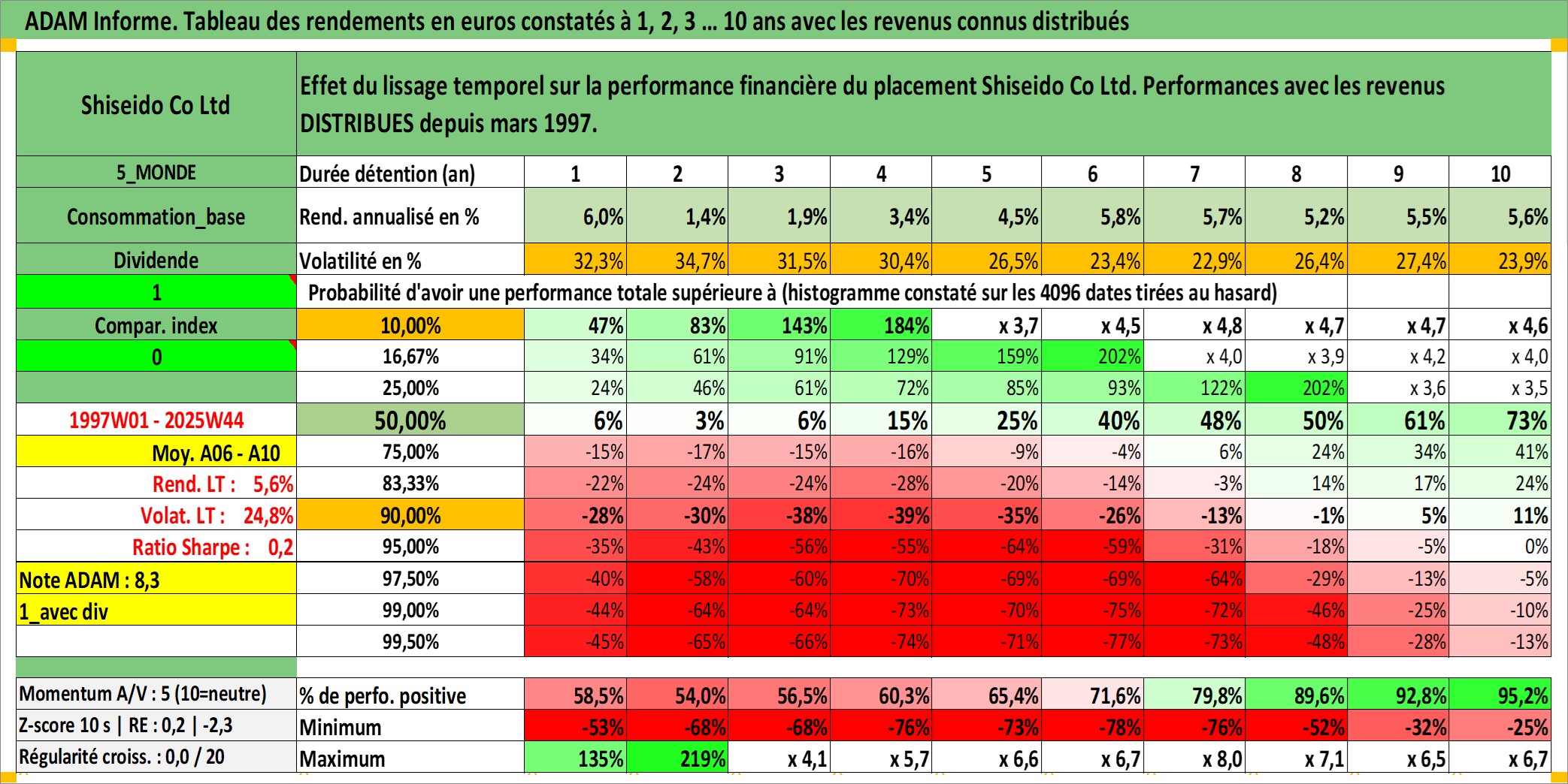 Site dédié aux investisseursPage dédiée sur site financeAnalyse des valorisations hebdomadaires de l'action Shiseido Co Ltd. Cet actif est cote en JPY. Les valorisations sont en contrevaleur EURO et couvrent les semaines 1997W01 a 2025W44. Les revenus de cet actif financier sont pris en compte depuis la semaine 1997W13. La note globale ESG de cet actif est estimee a 7.0 (apres rebasage entre 0 et 20).