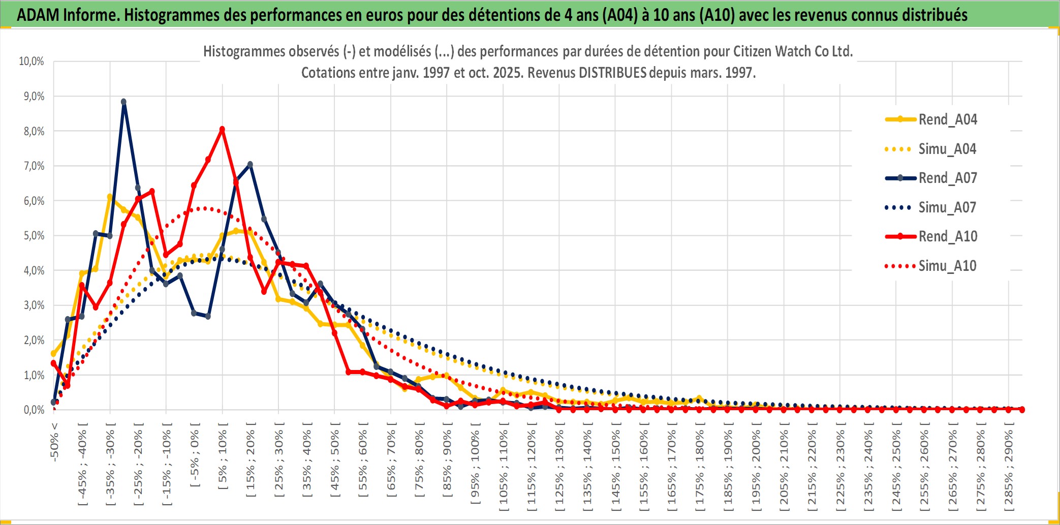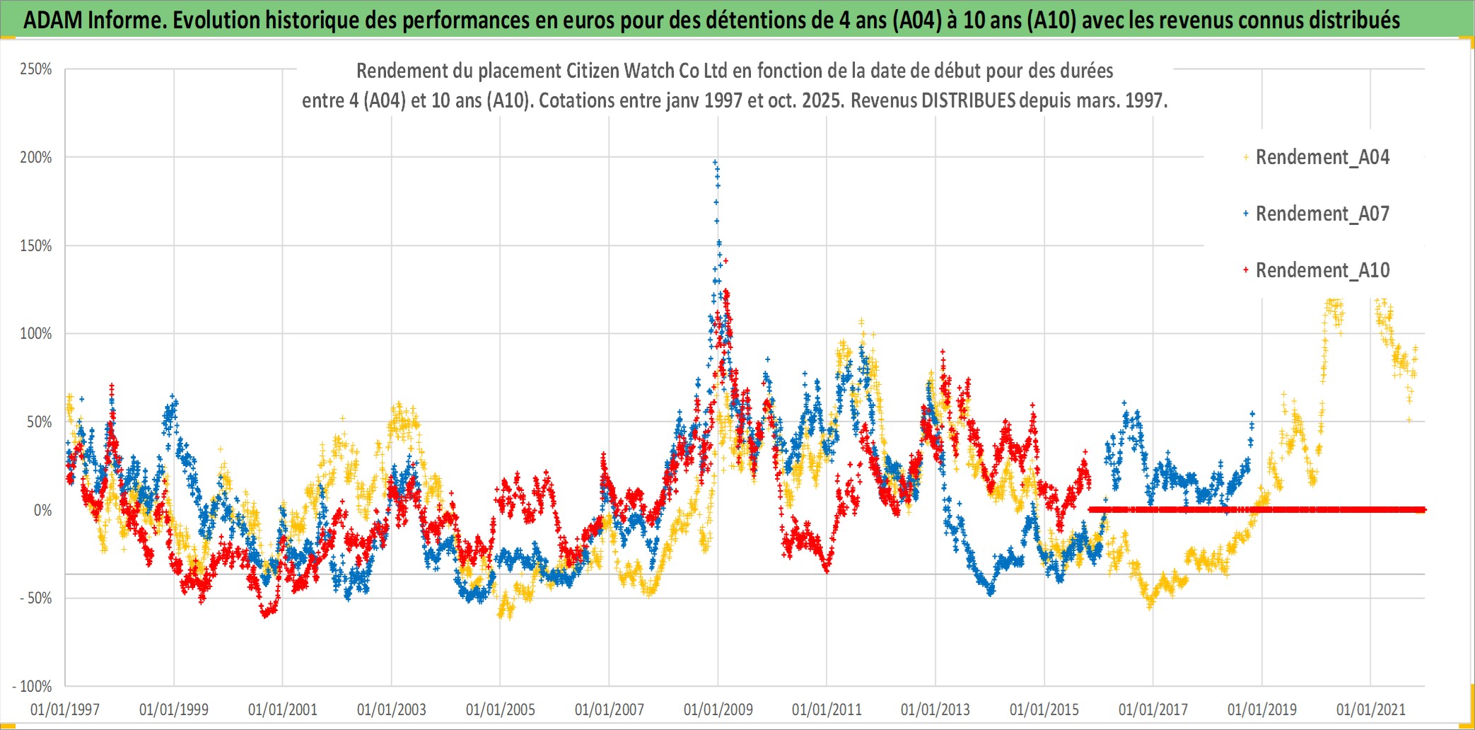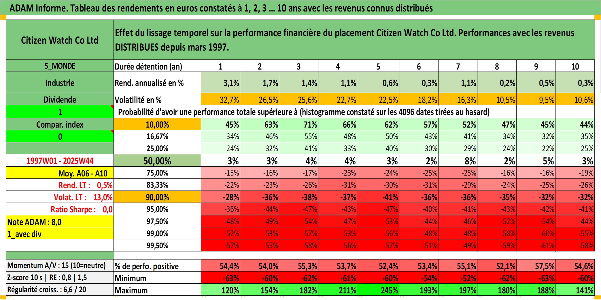 Site dédié aux investisseursPage dédiée sur site financeAnalyse des valorisations hebdomadaires de l'action Citizen Watch Co Ltd. Cet actif est cote en JPY. Les valorisations sont en contrevaleur EURO et couvrent les semaines 1997W01 a 2025W44. Les revenus de cet actif financier sont pris en compte depuis la semaine 1997W13. La note ESG de cet actif n'est pas connue.