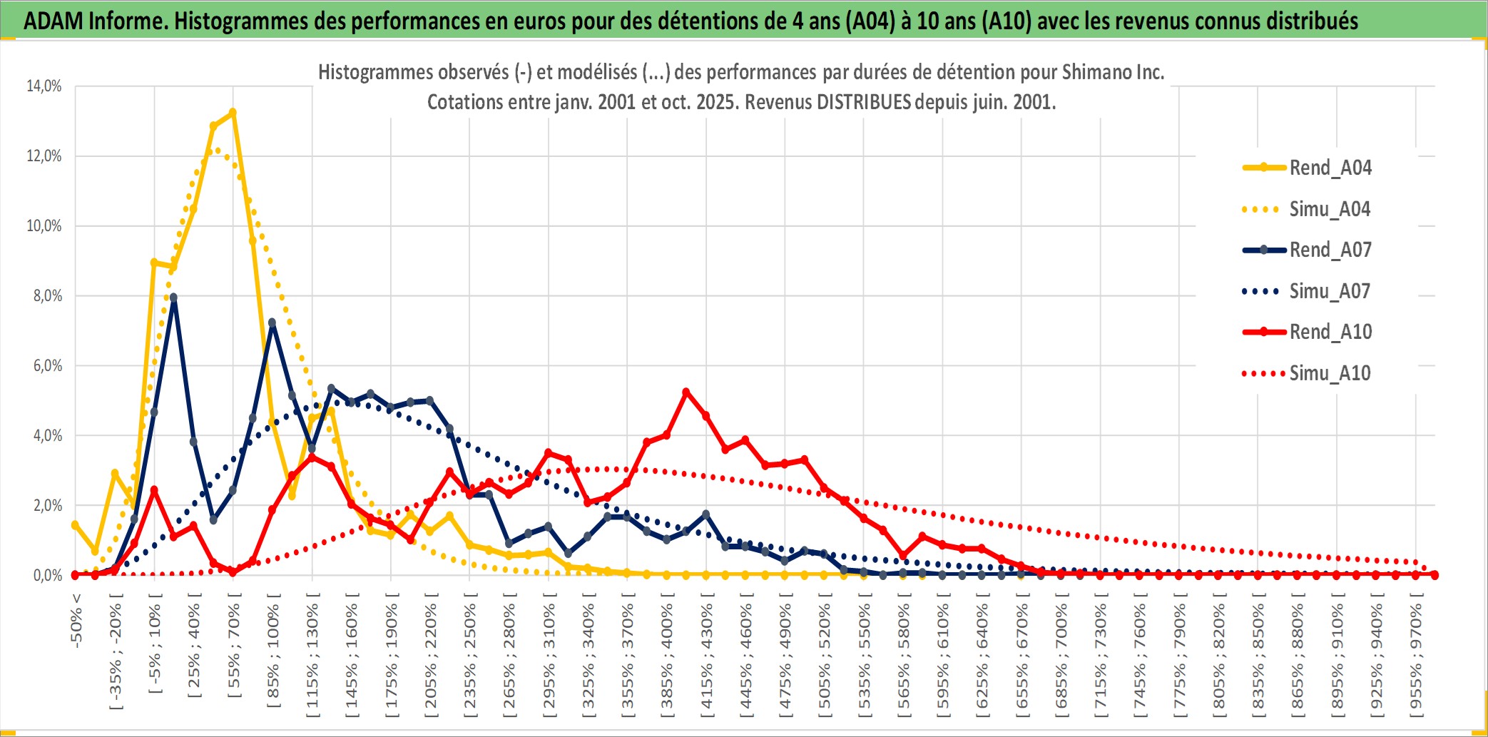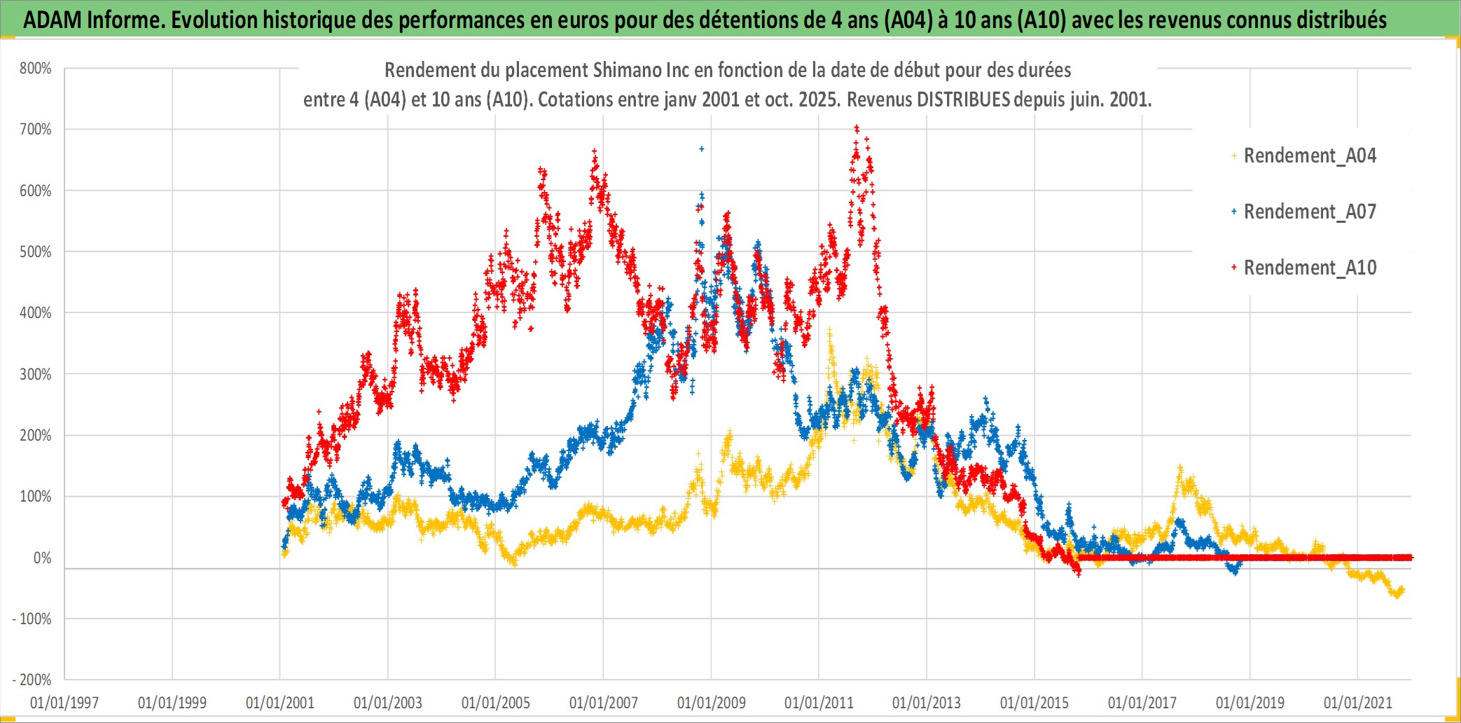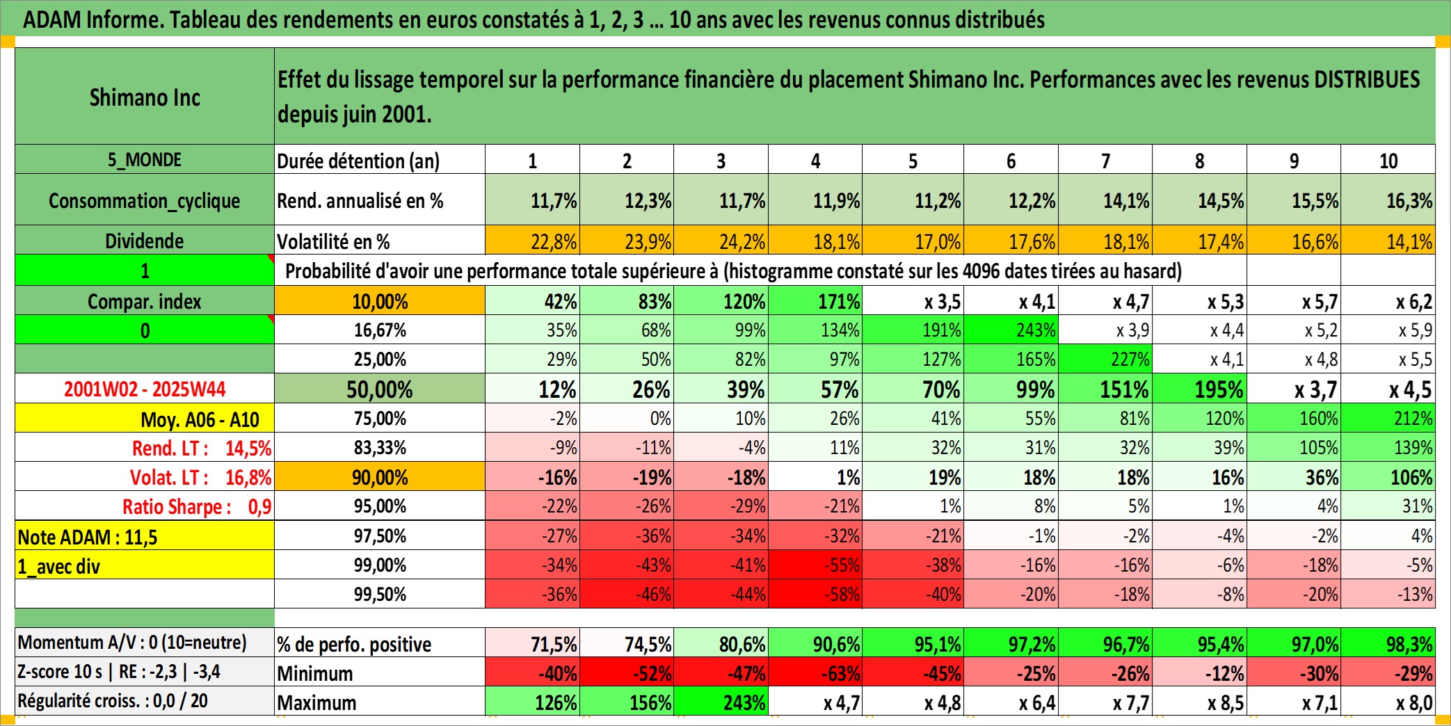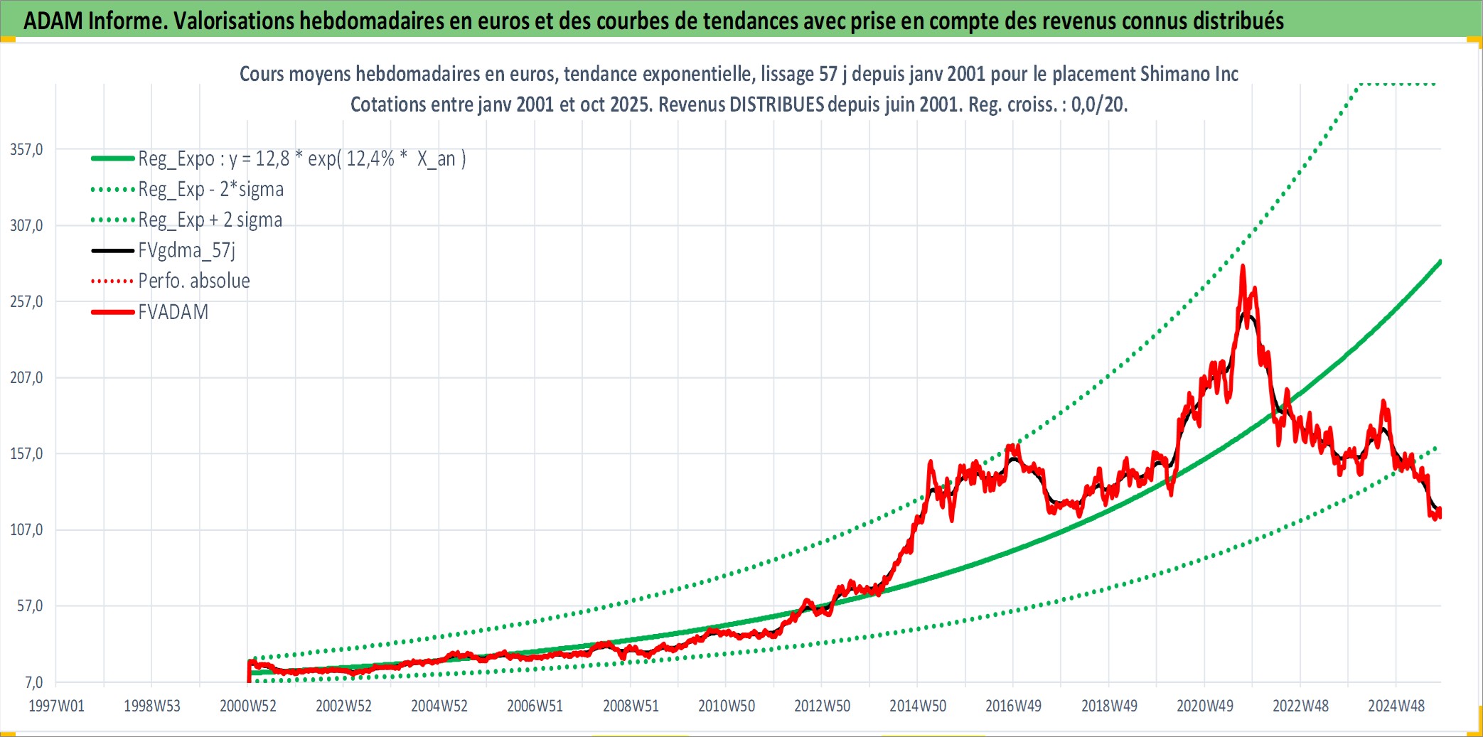 Site dédié aux investisseursPage dédiée sur site financeAnalyse des valorisations hebdomadaires de l'action Shimano Inc. Cet actif est cote en JPY. Les valorisations sont en contrevaleur EURO et couvrent les semaines 2001W02 a 2025W44. Les revenus de cet actif financier sont pris en compte depuis la semaine 2001W26. La note globale ESG de cet actif est estimee a 13.0 (apres rebasage entre 0 et 20).
