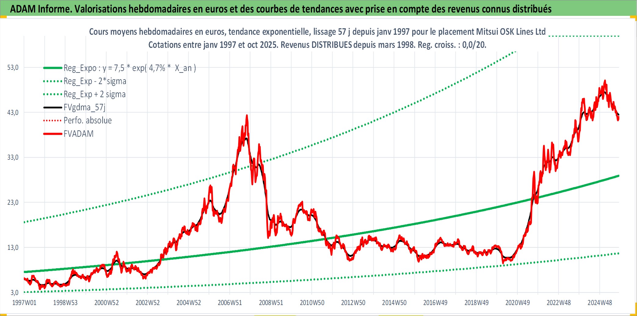 Site dédié aux investisseursPage dédiée sur site financeAnalyse des valorisations hebdomadaires de l'action Mitsui OSK Lines Ltd. Cet actif est cote en JPY. Les valorisations sont en contrevaleur EURO et couvrent les semaines 1997W01 a 2025W44. Les revenus de cet actif financier sont pris en compte depuis la semaine 1998W13. La note ESG de cet actif n'est pas connue.