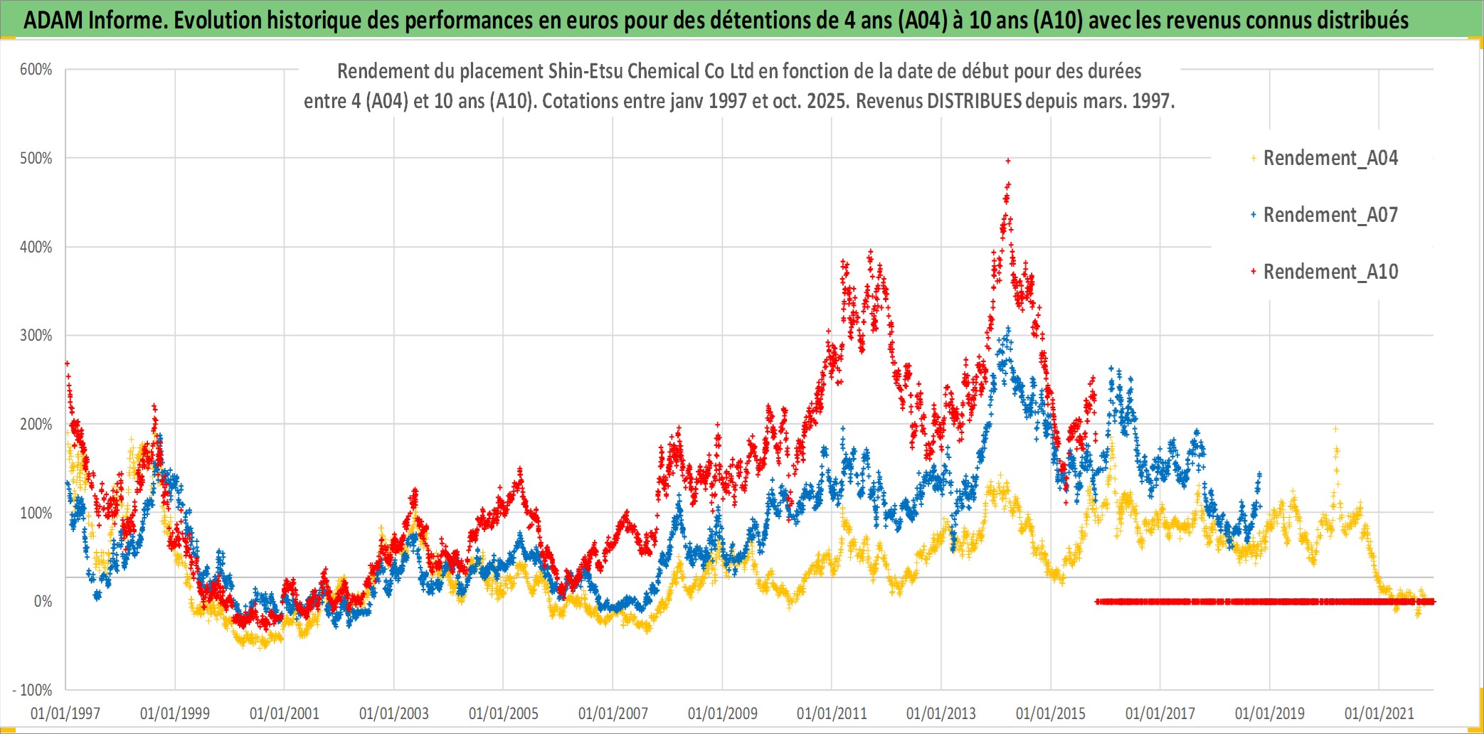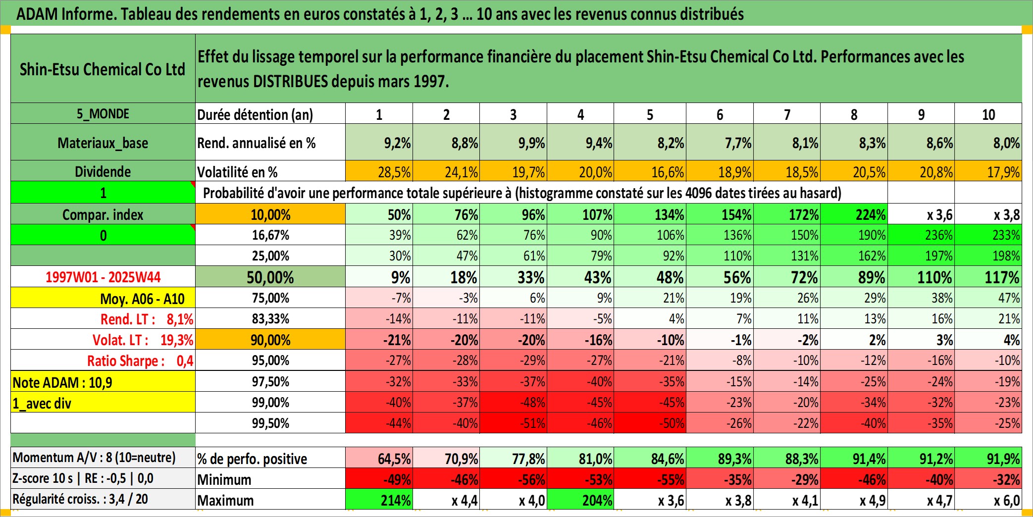Site dédié aux investisseursPage dédiée sur site financeAnalyse des valorisations hebdomadaires de l'action Shin-Etsu Chemical Co Ltd. Cet actif est cote en JPY. Les valorisations sont en contrevaleur EURO et couvrent les semaines 1997W01 a 2025W44. Les revenus de cet actif financier sont pris en compte depuis la semaine 1997W13. La note globale ESG de cet actif est estimee a 5.0 (apres rebasage entre 0 et 20).