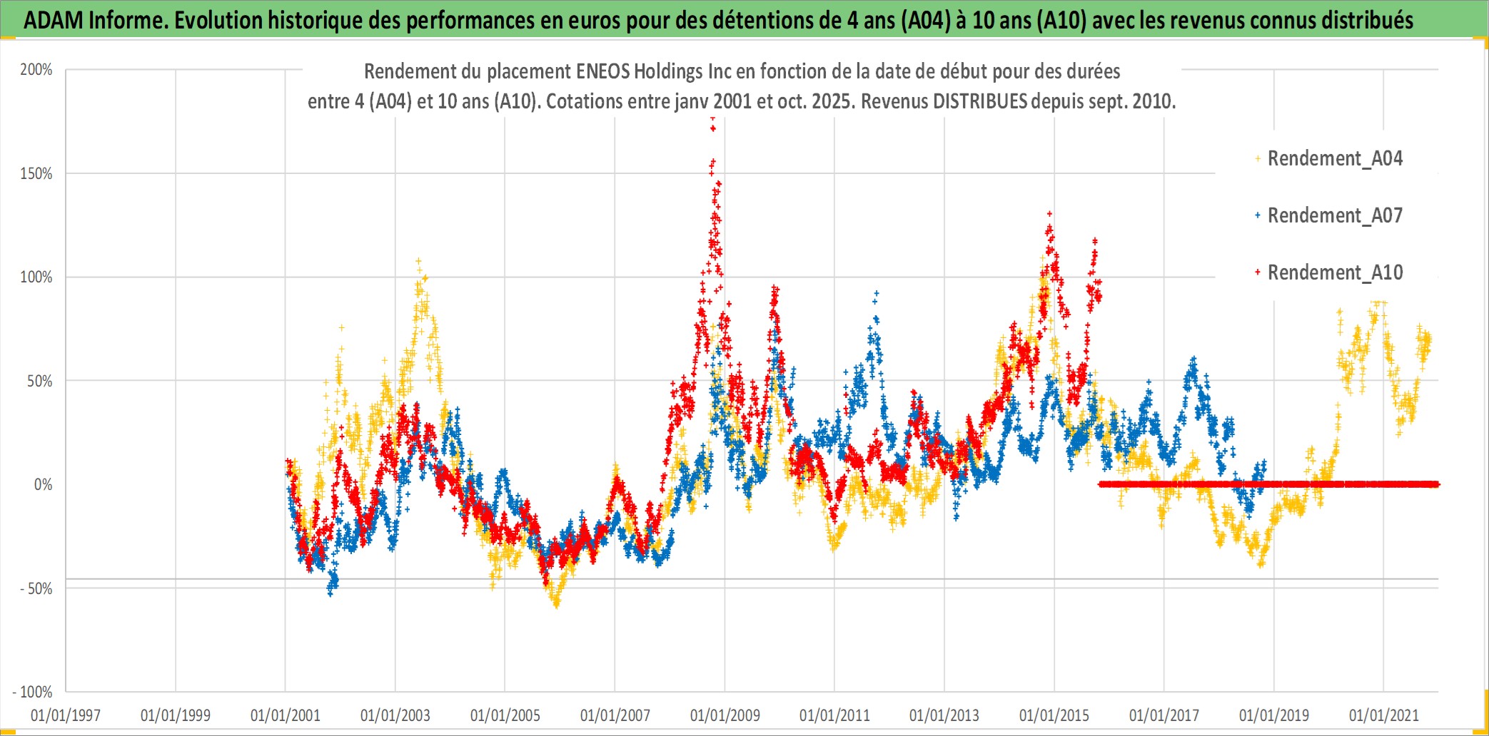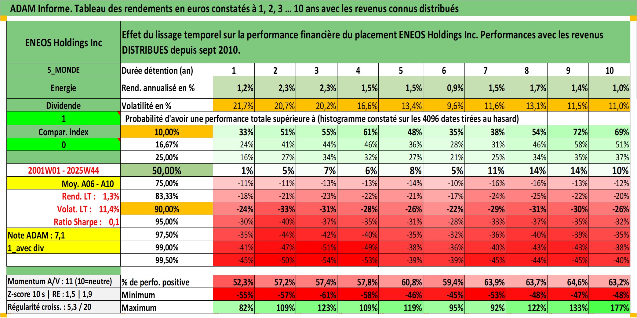 Site dédié aux investisseursPage dédiée sur site financeAnalyse des valorisations hebdomadaires de l'action ENEOS Holdings Inc. Cet actif est cote en JPY. Les valorisations sont en contrevaleur EURO et couvrent les semaines 2001W01 a 2025W44. Les revenus de cet actif financier sont pris en compte depuis la semaine 2010W39. La note globale ESG de cet actif est estimee a 5.0 (apres rebasage entre 0 et 20).