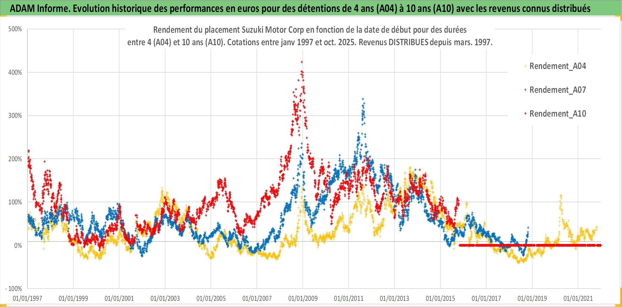 Site dédié aux investisseursPage dédiée sur site financeAnalyse des valorisations hebdomadaires de l'action Suzuki Motor Corp. Cet actif est cote en JPY. Les valorisations sont en contrevaleur EURO et couvrent les semaines 1997W01 a 2025W44. Les revenus de cet actif financier sont pris en compte depuis la semaine 1997W13. La note globale ESG de cet actif est estimee a 7.0 (apres rebasage entre 0 et 20).