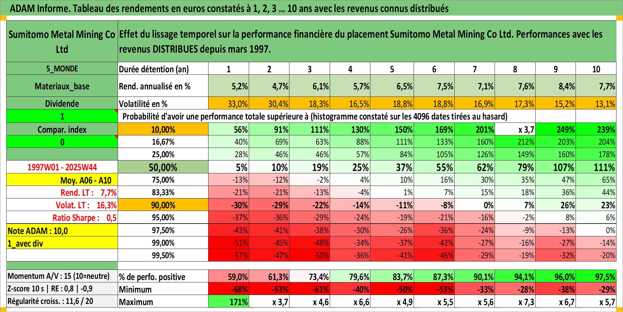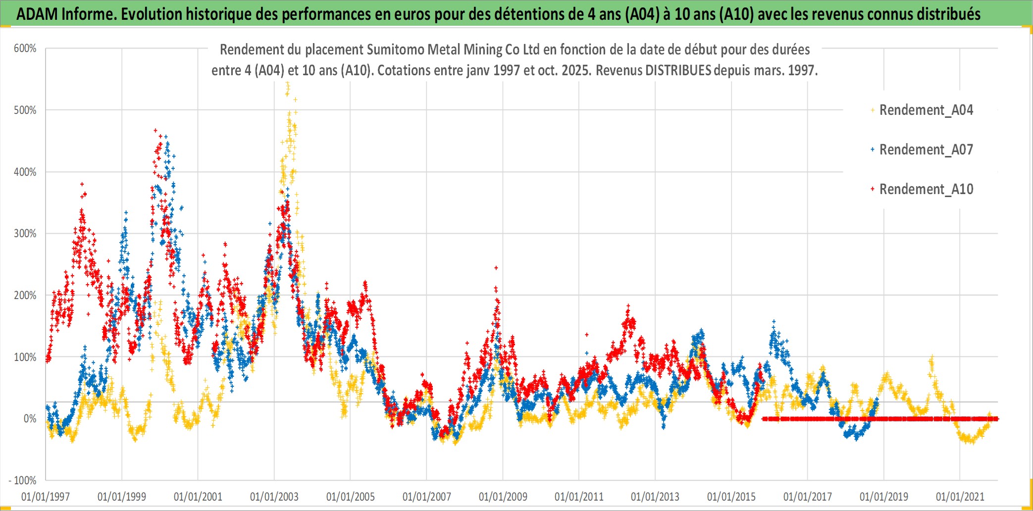 Site dédié aux investisseursPage dédiée sur site financeAnalyse des valorisations hebdomadaires de l'action Sumitomo Metal Mining Co Ltd. Cet actif est cote en JPY. Les valorisations sont en contrevaleur EURO et couvrent les semaines 1997W01 a 2025W44. Les revenus de cet actif financier sont pris en compte depuis la semaine 1997W13. La note globale ESG de cet actif est estimee a 3.0 (apres rebasage entre 0 et 20).