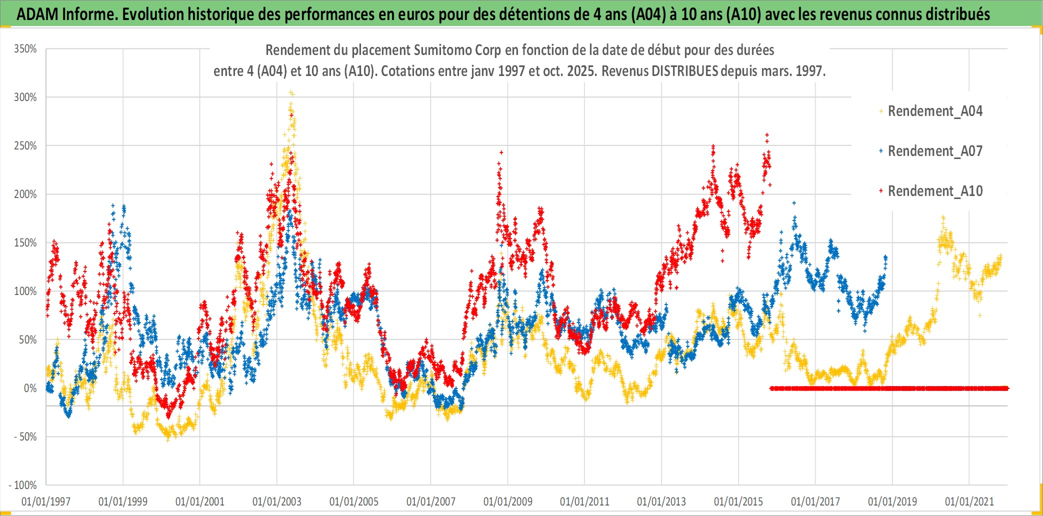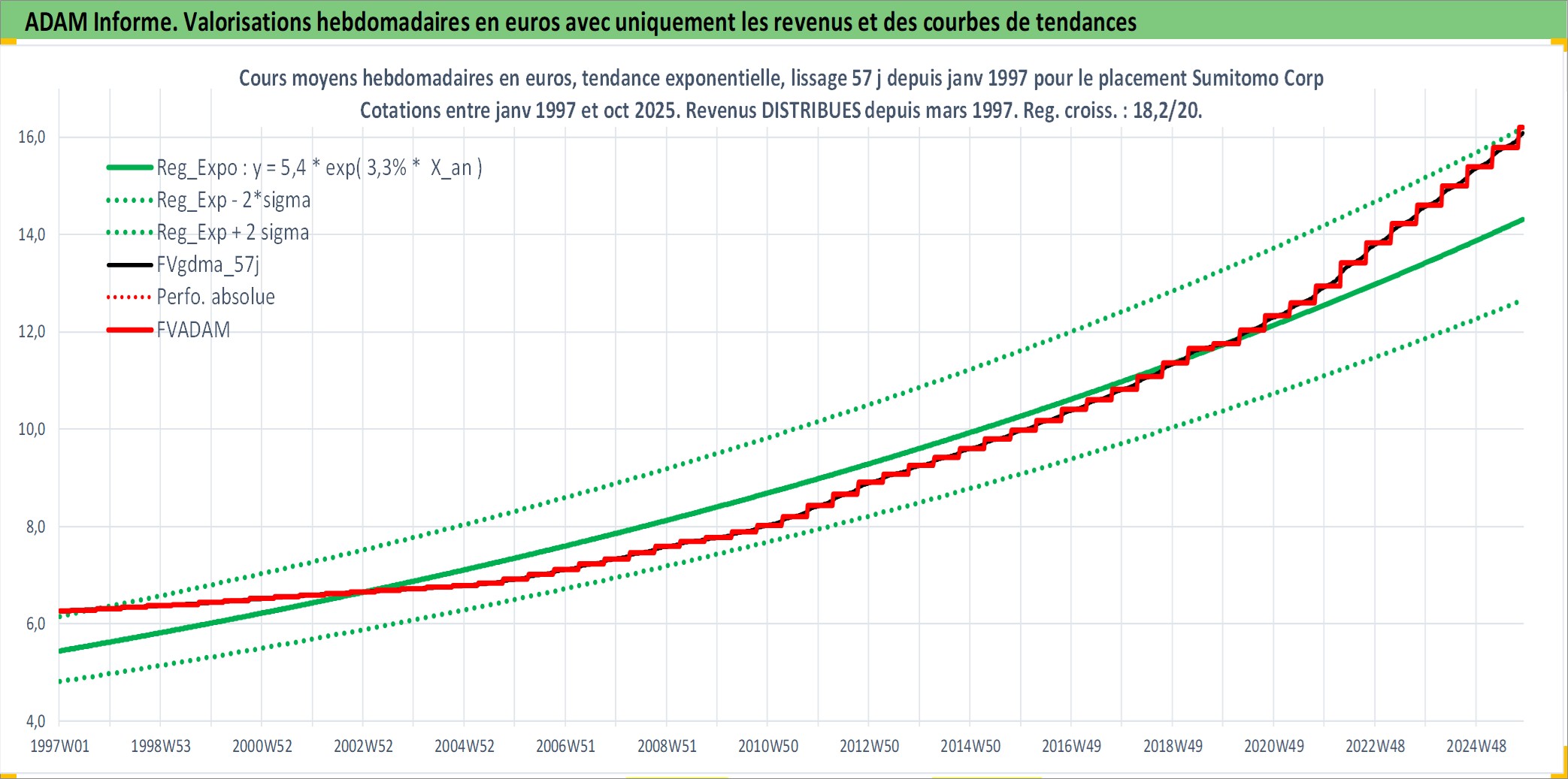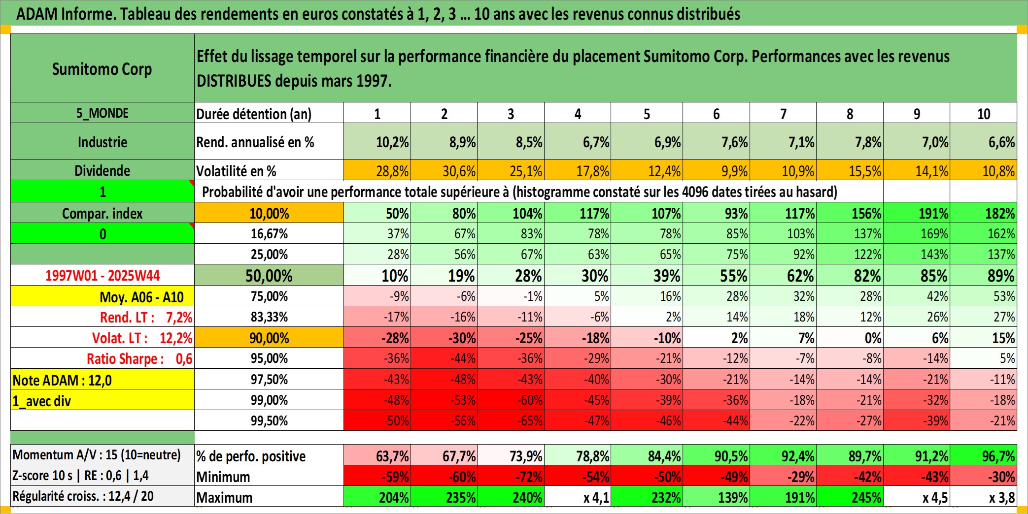 Site dédié aux investisseursPage dédiée sur site financeAnalyse des valorisations hebdomadaires de l'action Sumitomo Corp. Cet actif est cote en JPY. Les valorisations sont en contrevaleur EURO et couvrent les semaines 1997W01 a 2025W44. Les revenus de cet actif financier sont pris en compte depuis la semaine 1997W13. La note globale ESG de cet actif est estimee a 7.0 (apres rebasage entre 0 et 20).