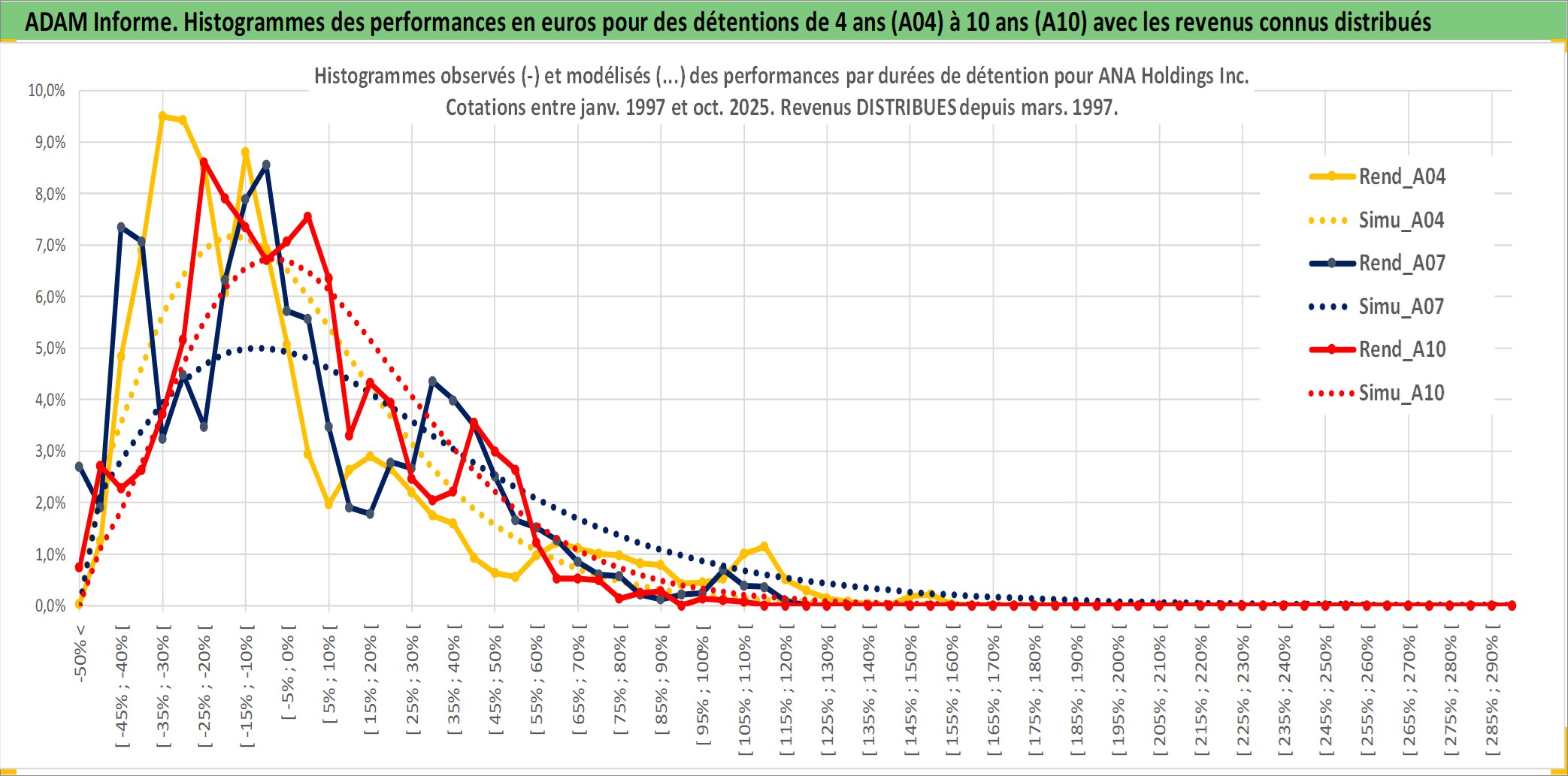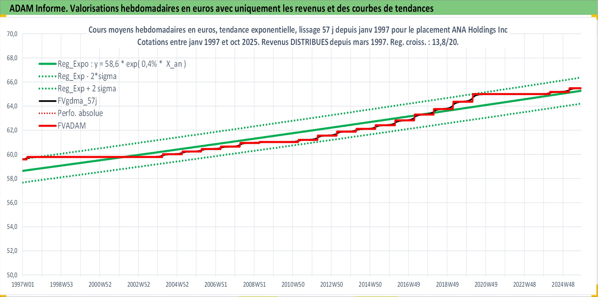 Site dédié aux investisseursPage dédiée sur site financeAnalyse des valorisations hebdomadaires de l'action ANA Holdings Inc. Cet actif est cote en JPY. Les valorisations sont en contrevaleur EURO et couvrent les semaines 1997W01 a 2025W44. Les revenus de cet actif financier sont pris en compte depuis la semaine 1997W13. La note globale ESG de cet actif est estimee a 4.0 (apres rebasage entre 0 et 20).