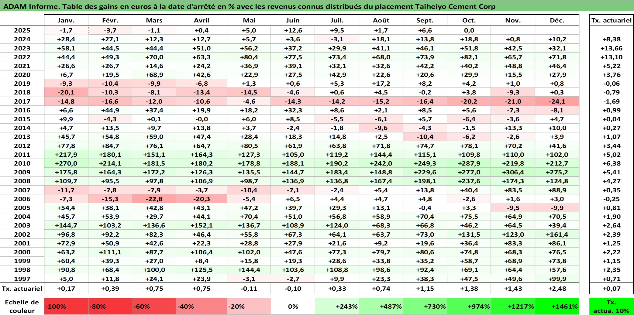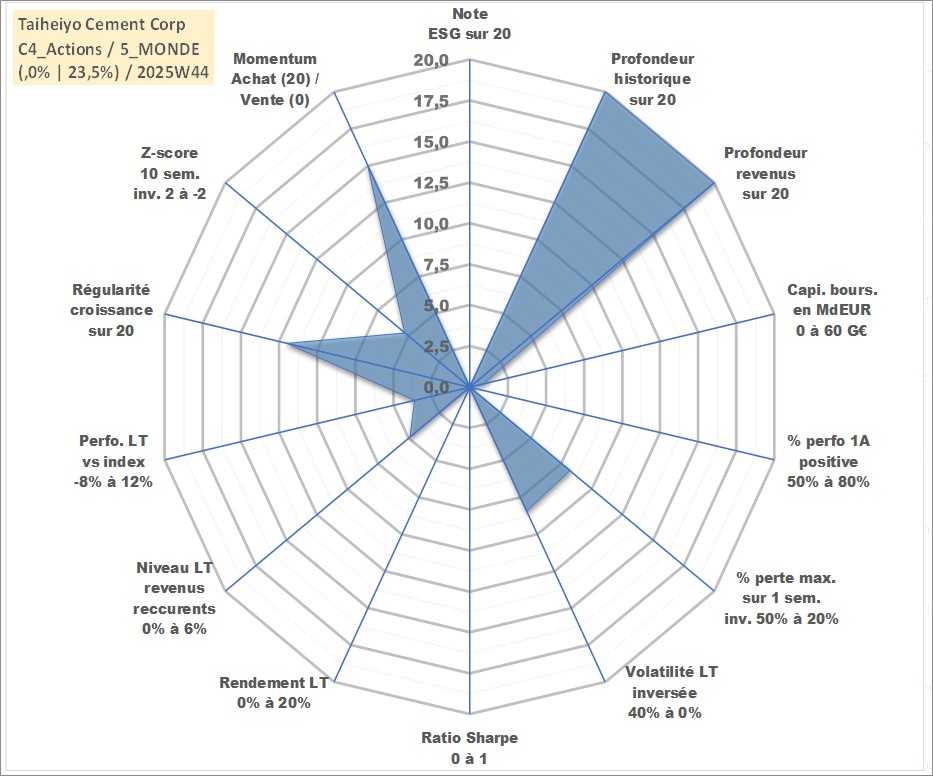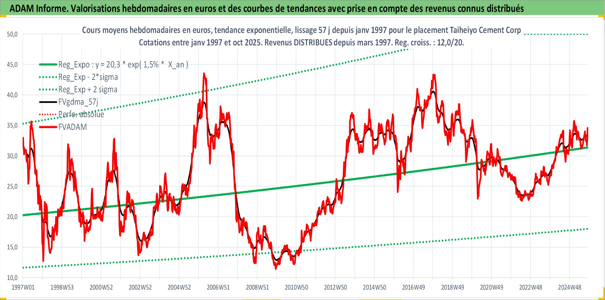 Site dédié aux investisseursPage dédiée sur site financeAnalyse des valorisations hebdomadaires de l'action Taiheiyo Cement Corp. Cet actif est cote en JPY. Les valorisations sont en contrevaleur EURO et couvrent les semaines 1997W01 a 2025W44. Les revenus de cet actif financier sont pris en compte depuis la semaine 1997W13. La note ESG de cet actif n'est pas connue.