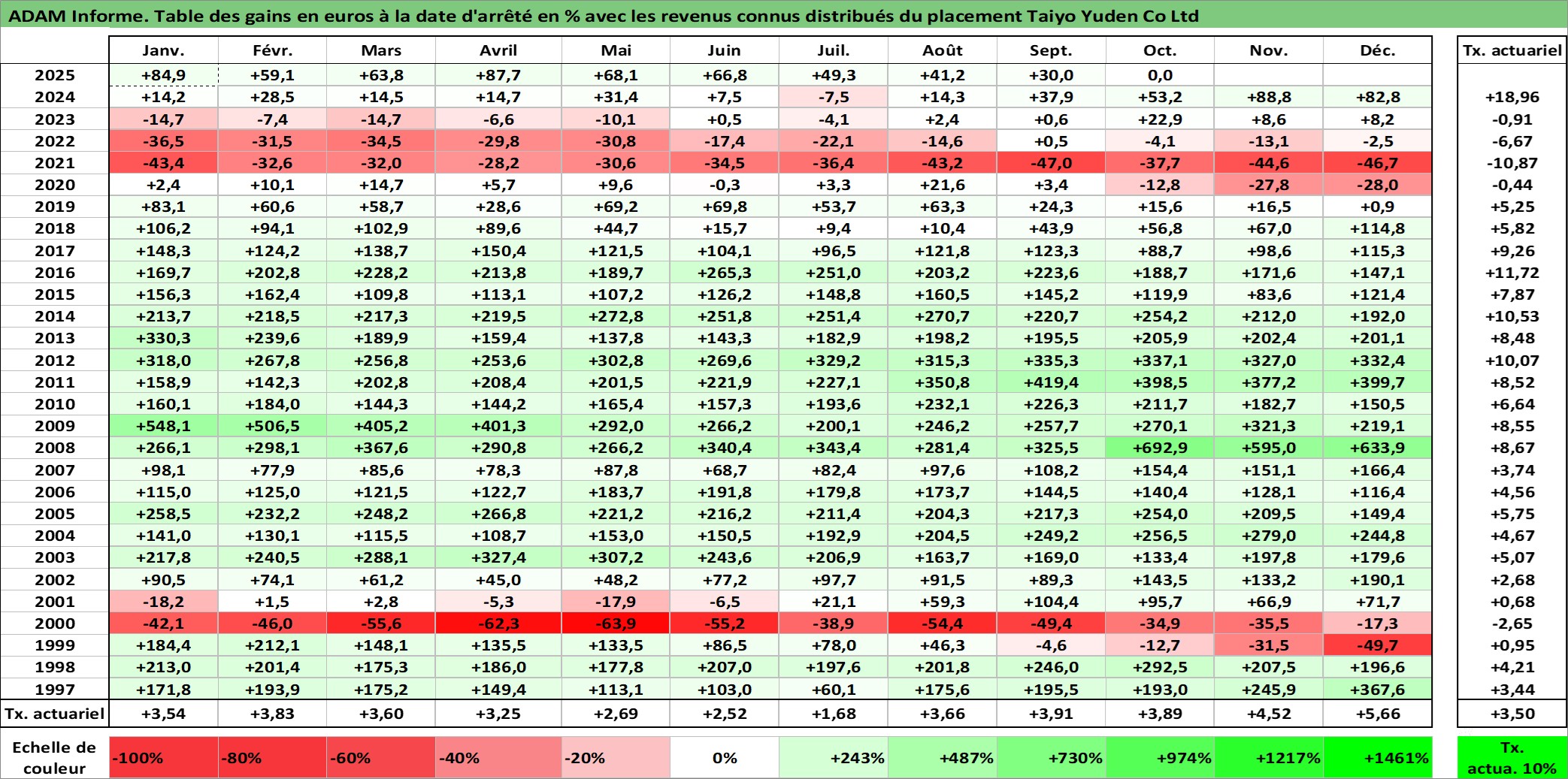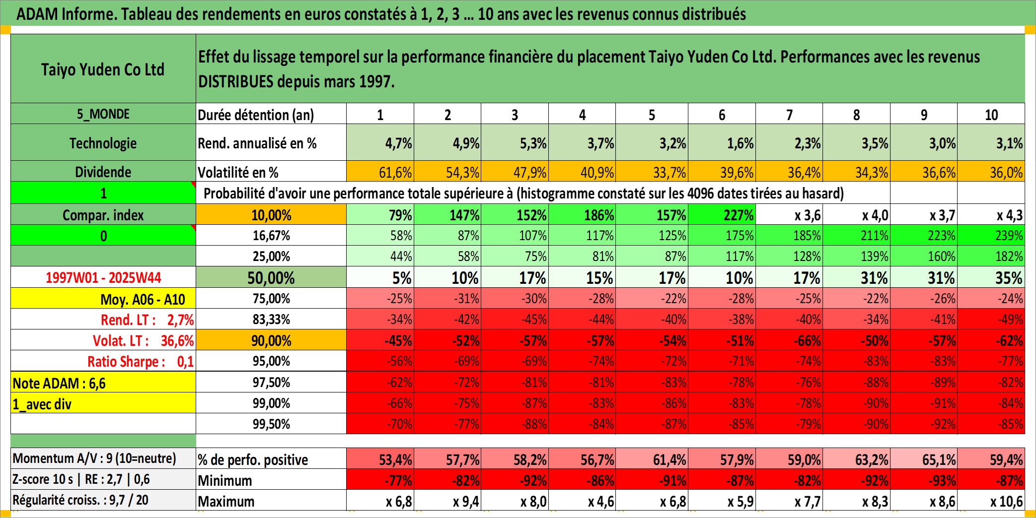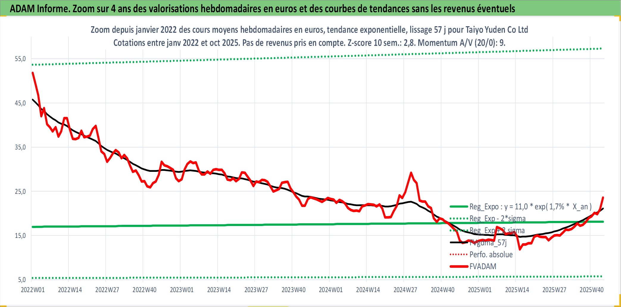 Site dédié aux investisseursPage dédiée sur site financeAnalyse des valorisations hebdomadaires de l'action Taiyo Yuden Co Ltd. Cet actif est cote en JPY. Les valorisations sont en contrevaleur EURO et couvrent les semaines 1997W01 a 2025W44. Les revenus de cet actif financier sont pris en compte depuis la semaine 1997W13. La note ESG de cet actif n'est pas connue.