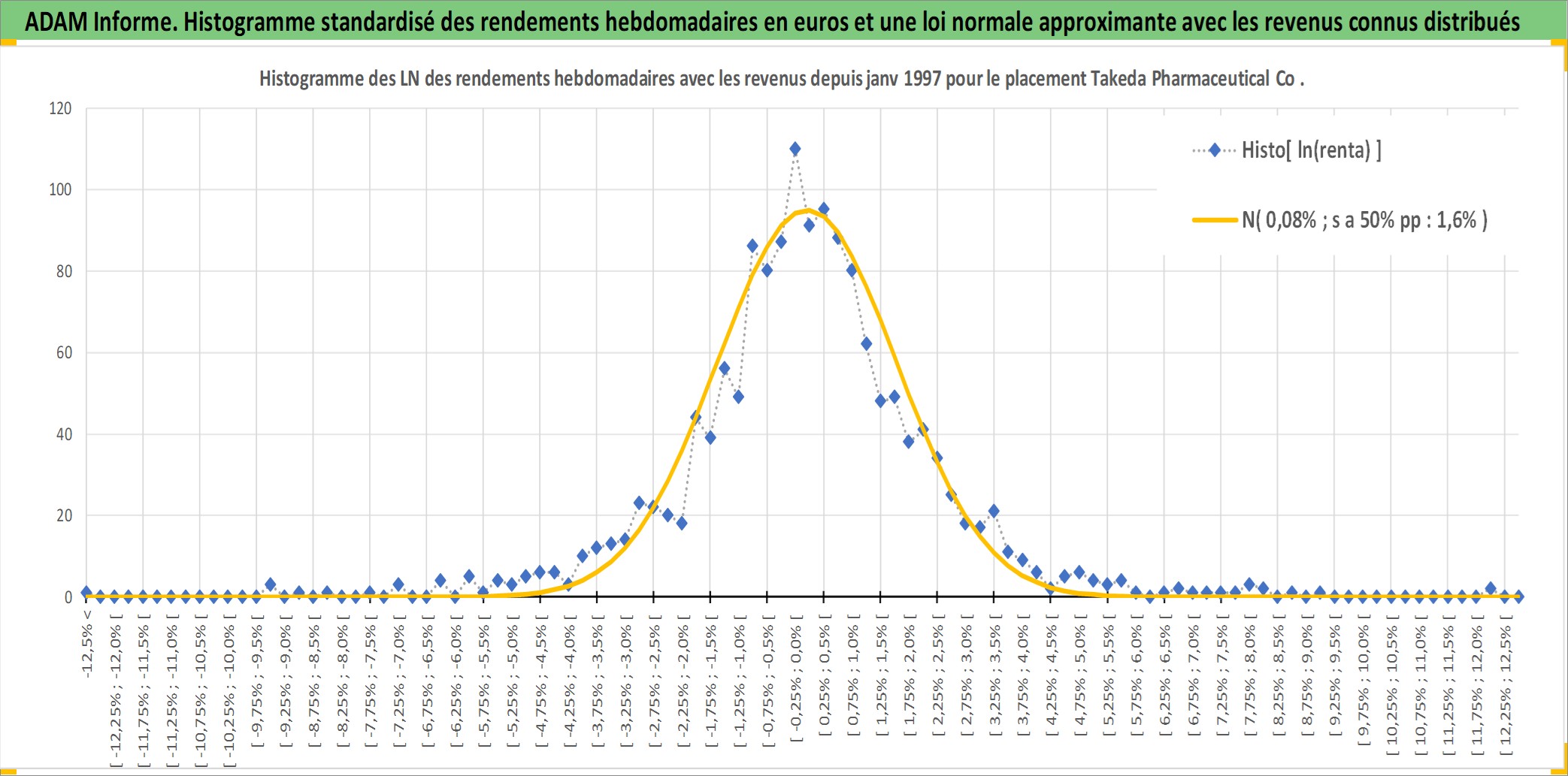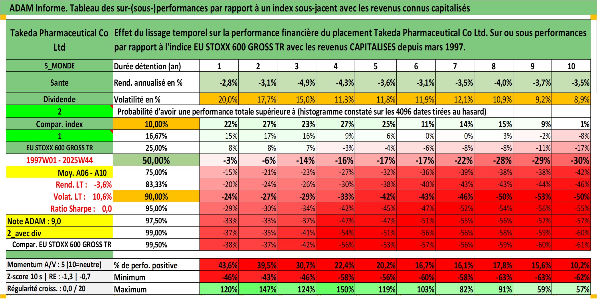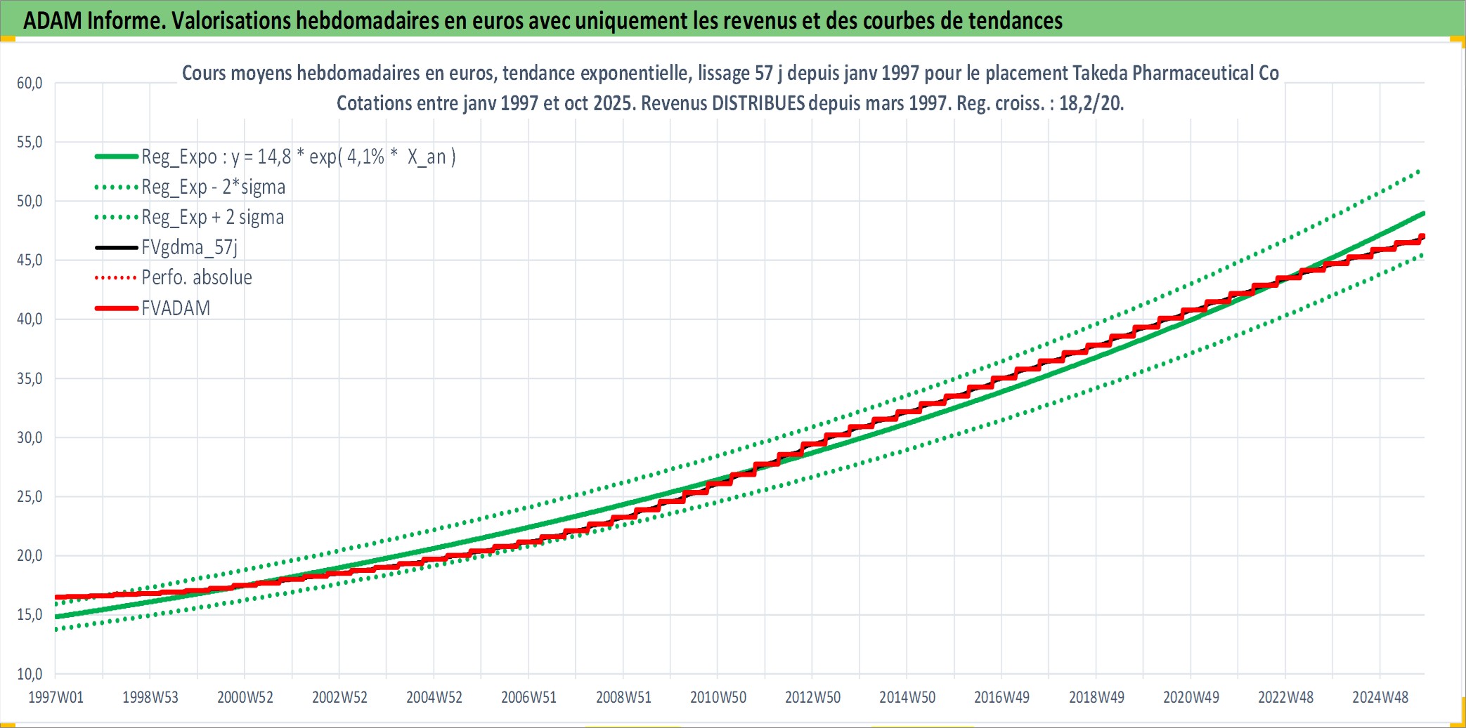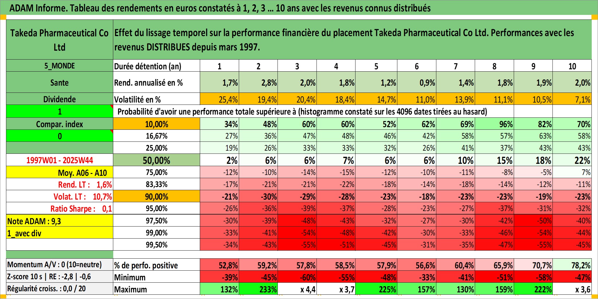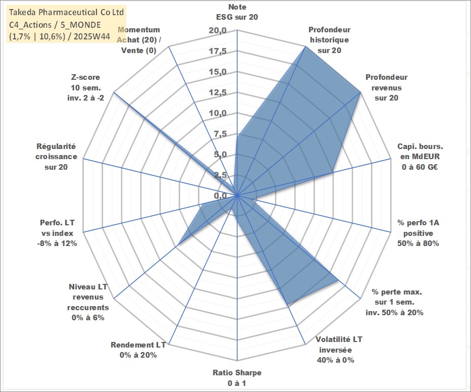 Site dédié aux investisseursPage dédiée sur site financeAnalyse des valorisations hebdomadaires de l'action Takeda Pharmaceutical Co Ltd. Cet actif est cote en JPY. Les valorisations sont en contrevaleur EURO et couvrent les semaines 1997W01 a 2025W44. Les revenus de cet actif financier sont pris en compte depuis la semaine 1997W13. La note globale ESG de cet actif est estimee a 7.0 (apres rebasage entre 0 et 20).
