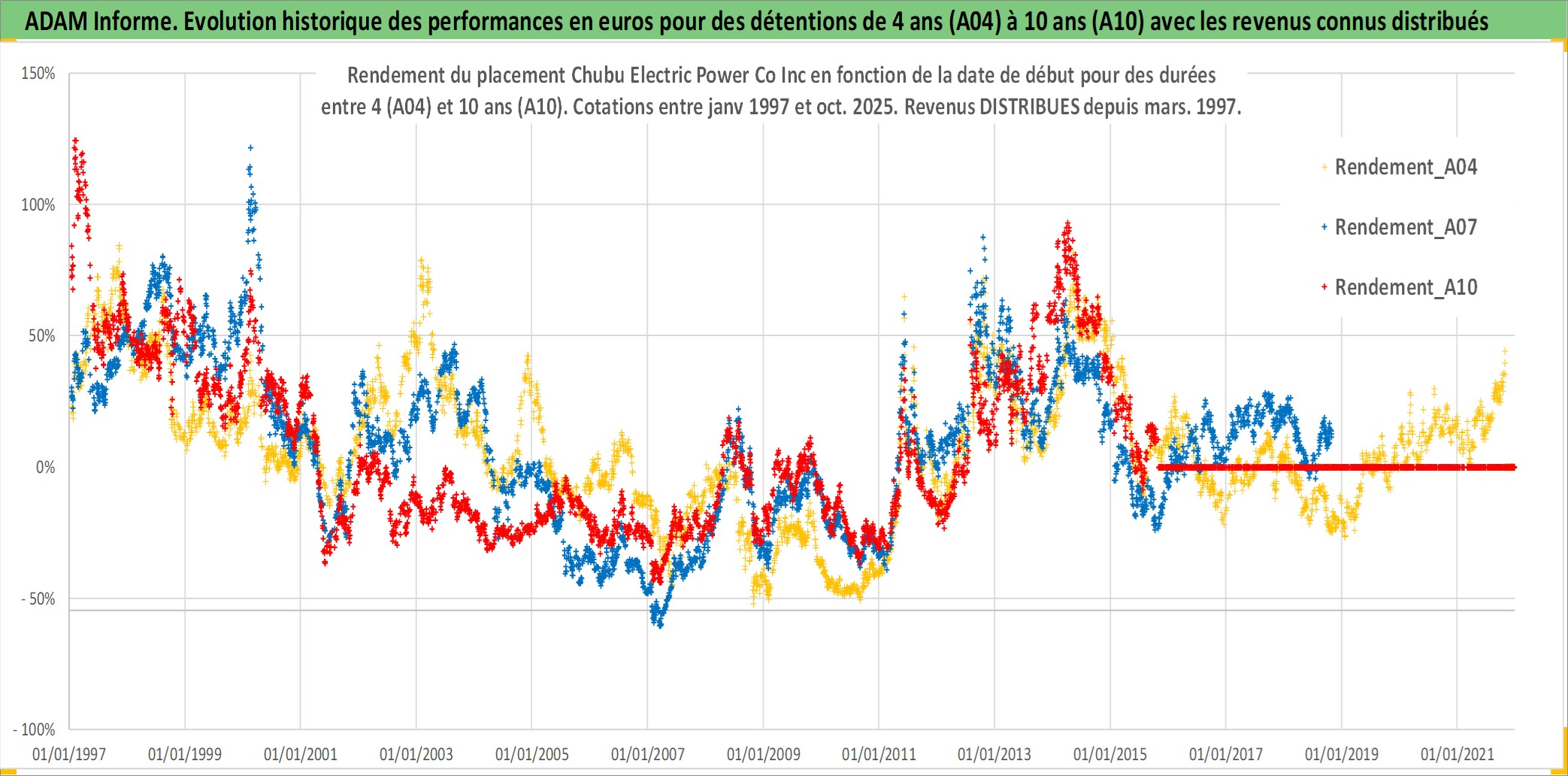 Site dédié aux investisseursPage dédiée sur site financeAnalyse des valorisations hebdomadaires de l'action Chubu Electric Power Co Inc. Cet actif est cote en JPY. Les valorisations sont en contrevaleur EURO et couvrent les semaines 1997W01 a 2025W44. Les revenus de cet actif financier sont pris en compte depuis la semaine 1997W13. La note globale ESG de cet actif est estimee a 2.0 (apres rebasage entre 0 et 20).