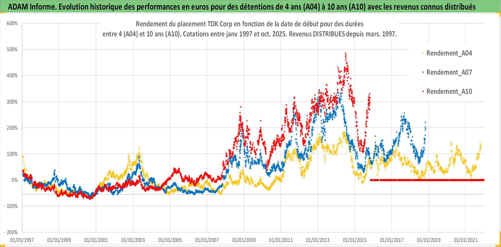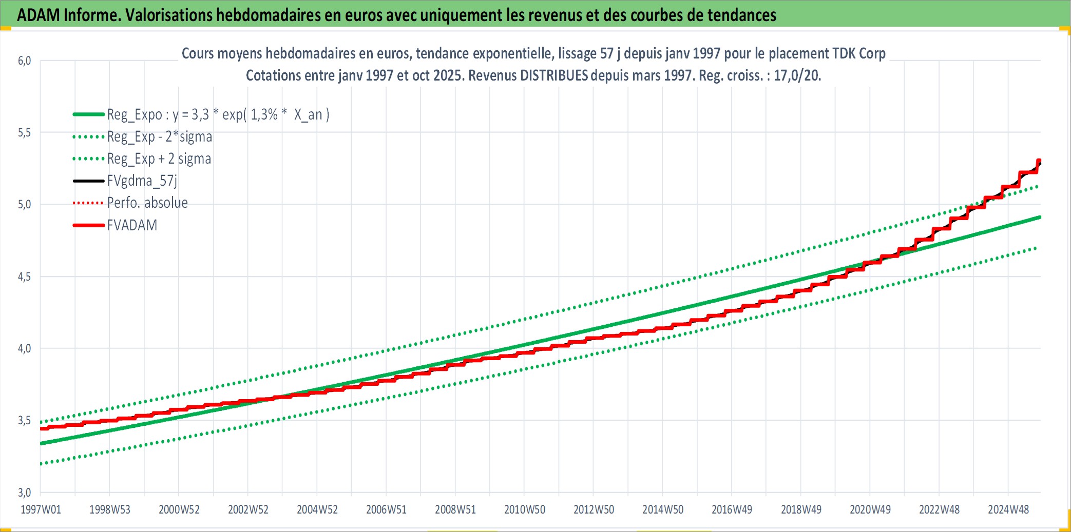Site dédié aux investisseursPage dédiée sur site financeAnalyse des valorisations hebdomadaires de l'action TDK Corp. Cet actif est cote en JPY. Les valorisations sont en contrevaleur EURO et couvrent les semaines 1997W01 a 2025W44. Les revenus de cet actif financier sont pris en compte depuis la semaine 1997W13. La note globale ESG de cet actif est estimee a 11.0 (apres rebasage entre 0 et 20).
