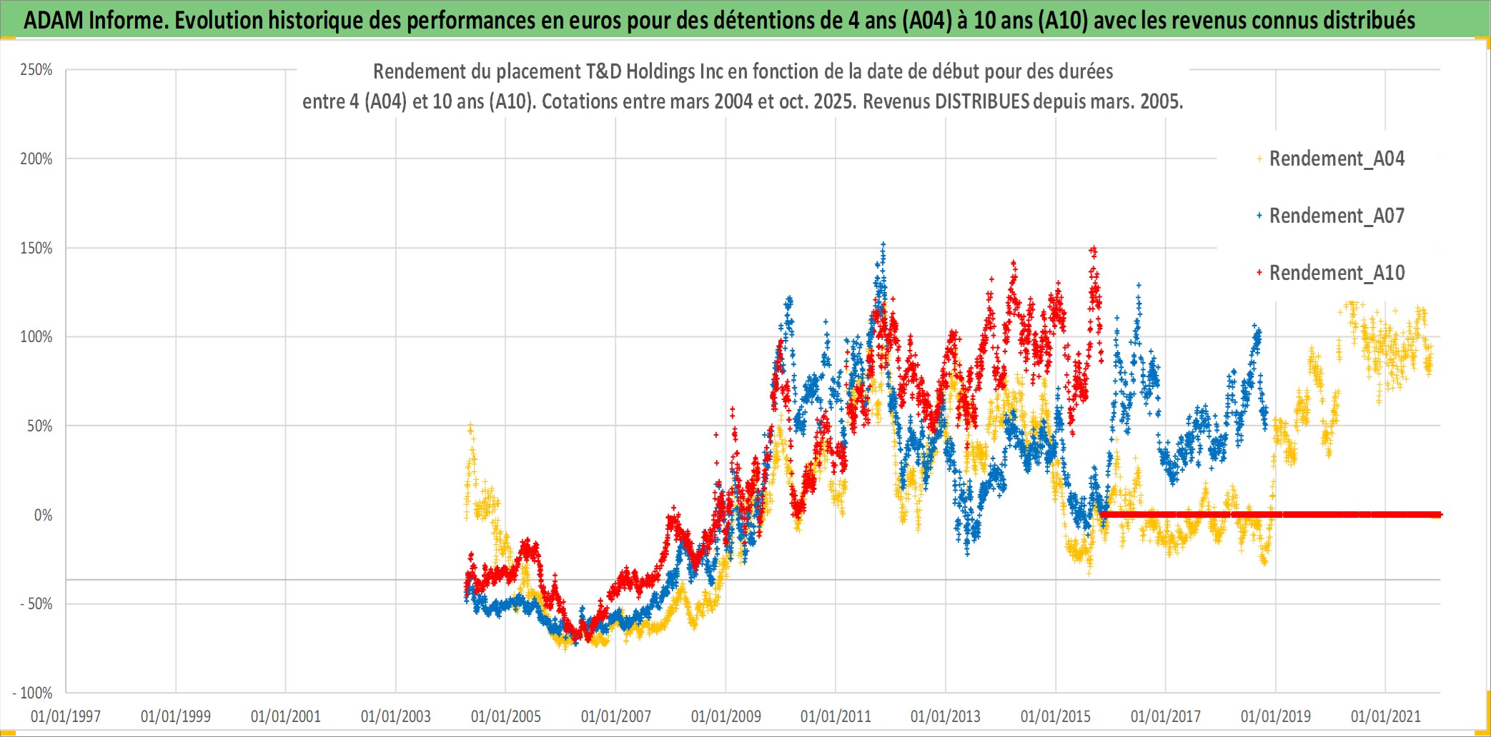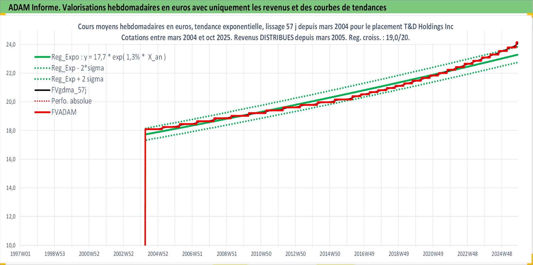 Site dédié aux investisseursPage dédiée sur site financeAnalyse des valorisations hebdomadaires de l'action T&D Holdings Inc. Cet actif est cote en JPY. Les valorisations sont en contrevaleur EURO et couvrent les semaines 2004W14 a 2025W44. Les revenus de cet actif financier sont pris en compte depuis la semaine 2005W13. La note globale ESG de cet actif est estimee a 7.0 (apres rebasage entre 0 et 20).
