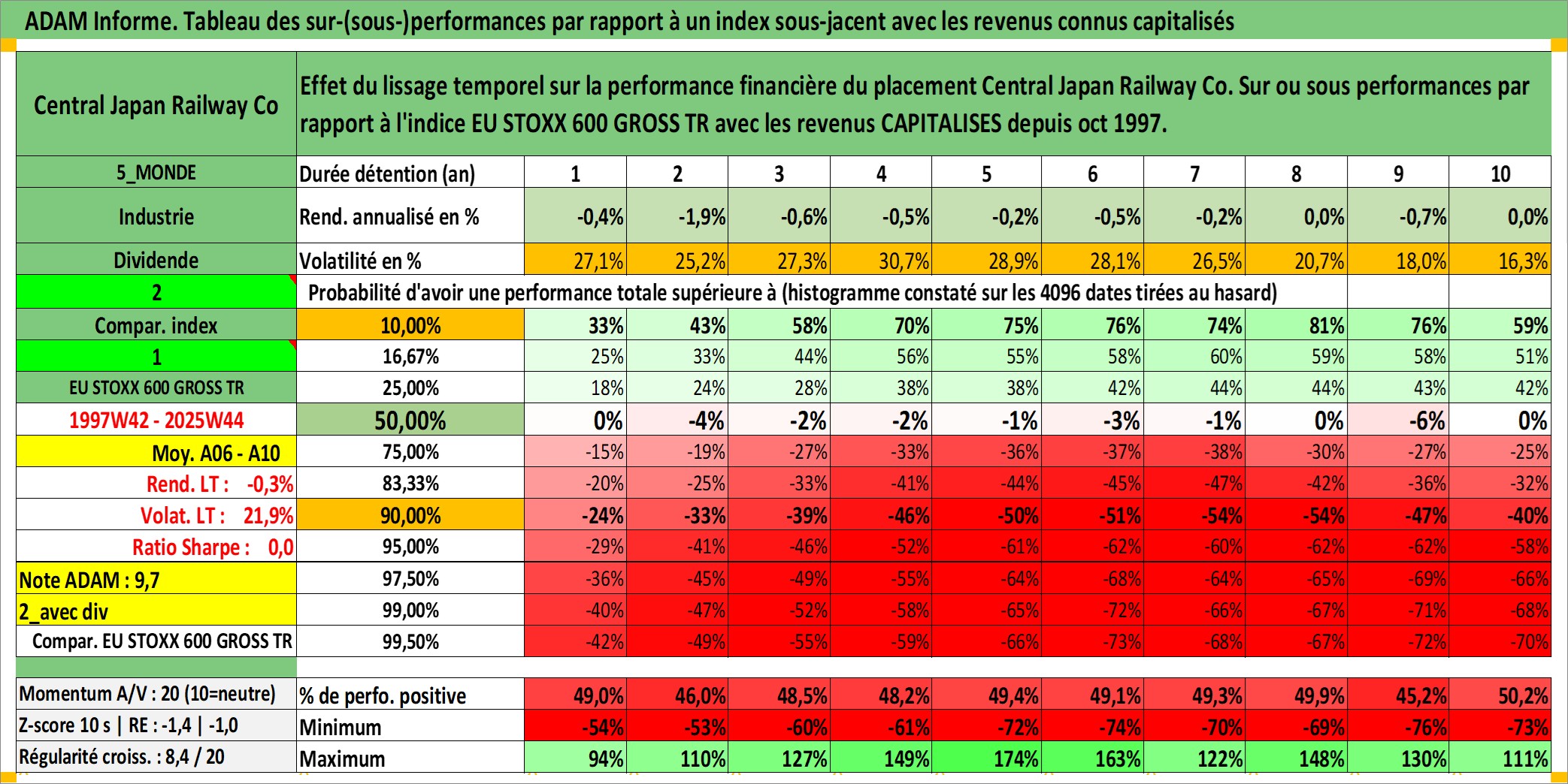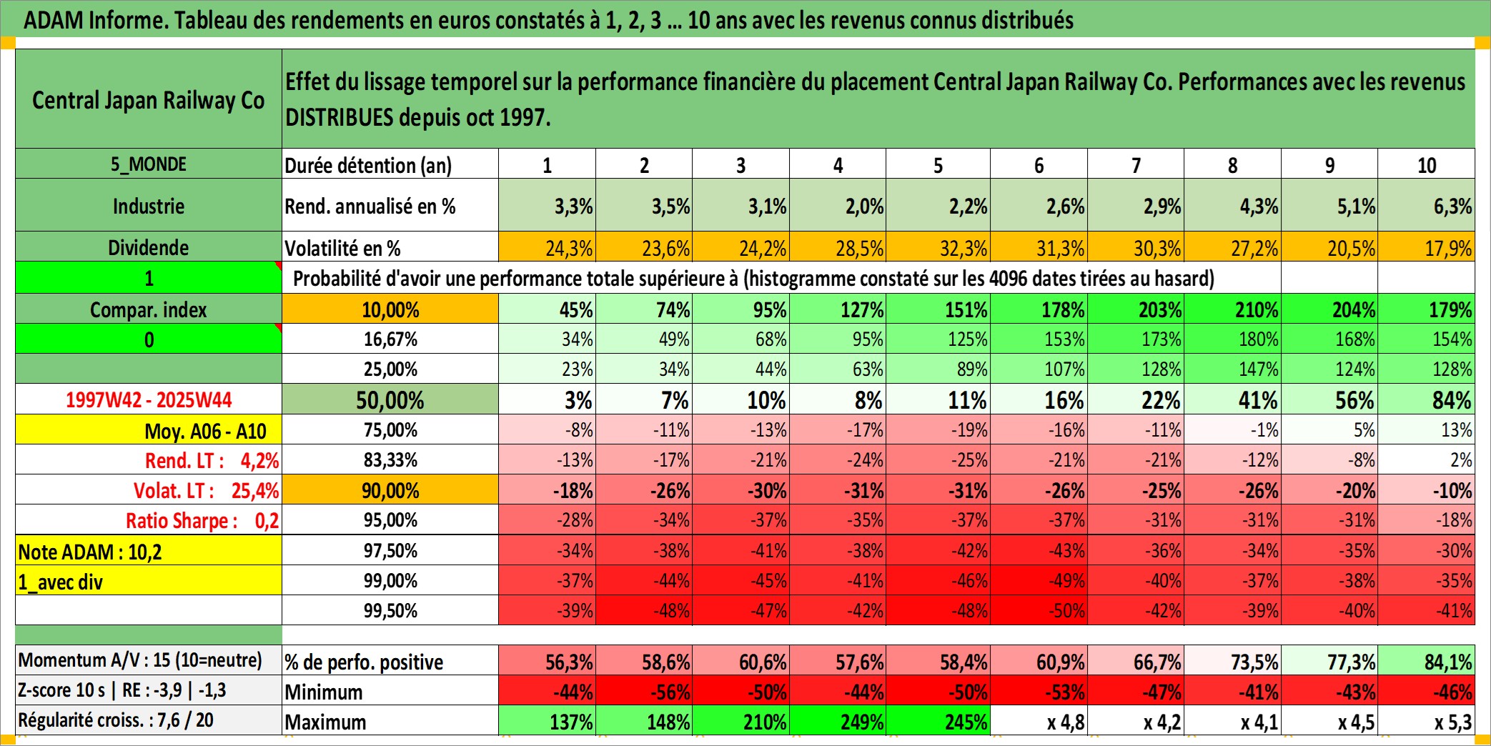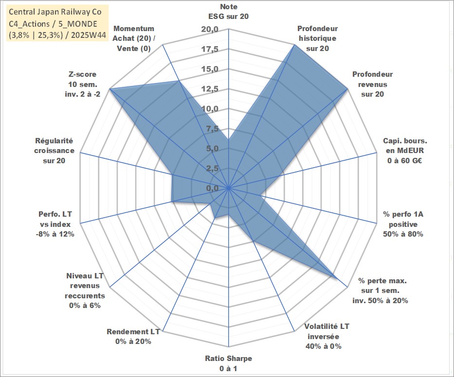 Site dédié aux investisseursPage dédiée sur site financeAnalyse des valorisations hebdomadaires de l'action Central Japan Railway Co. Cet actif est cote en JPY. Les valorisations sont en contrevaleur EURO et couvrent les semaines 1997W42 a 2025W44. Les revenus de cet actif financier sont pris en compte depuis la semaine 1997W43. La note globale ESG de cet actif est estimee a 6.0 (apres rebasage entre 0 et 20).