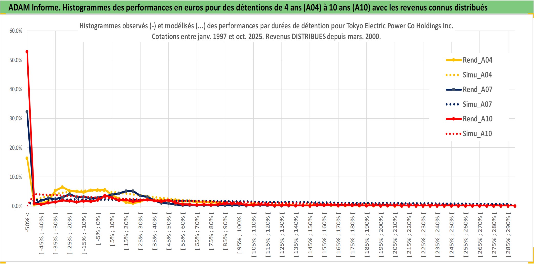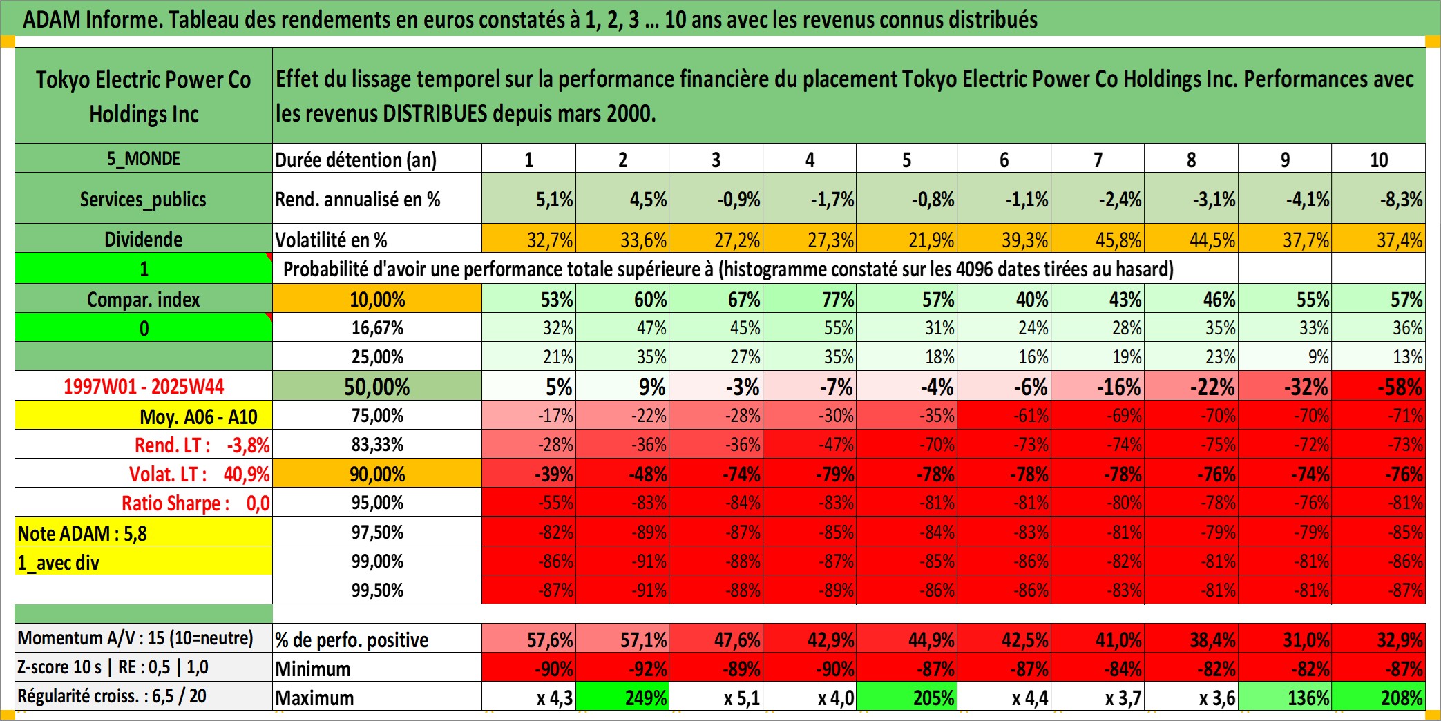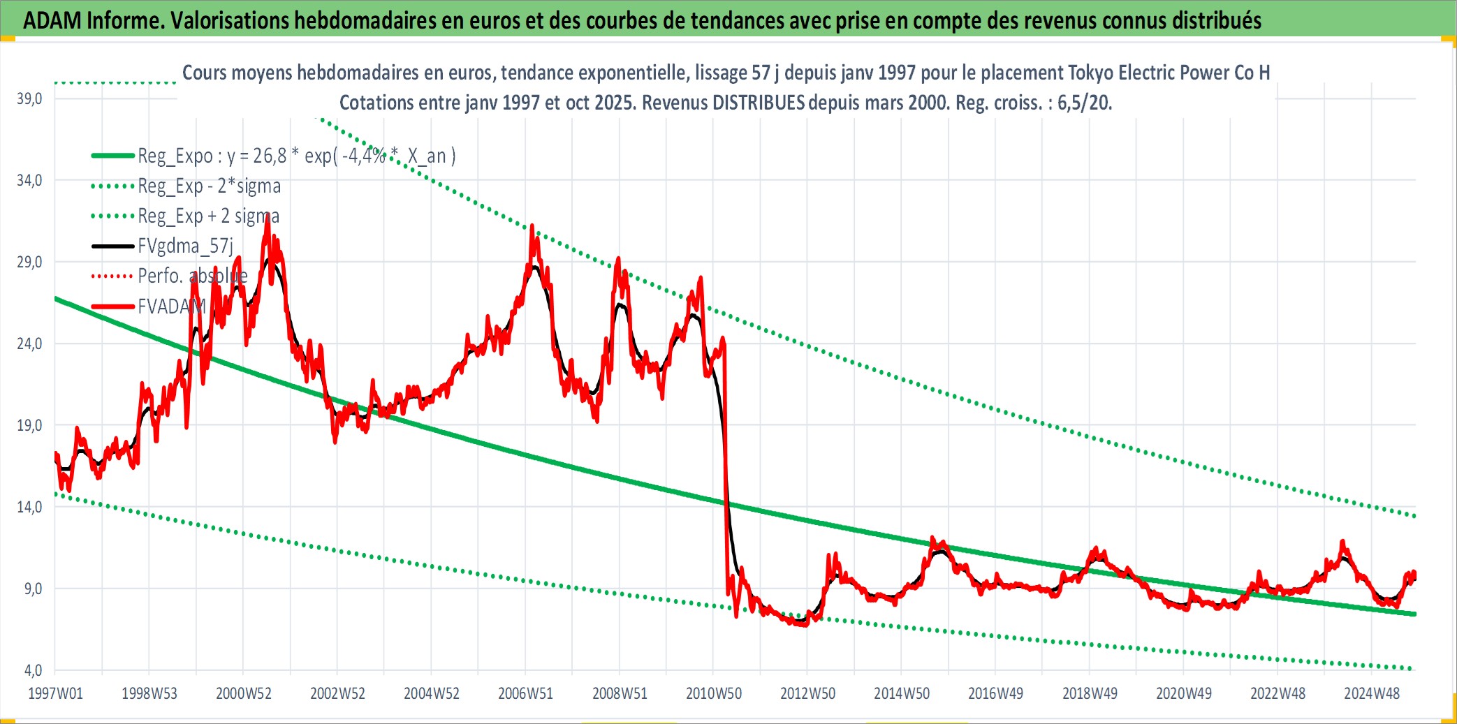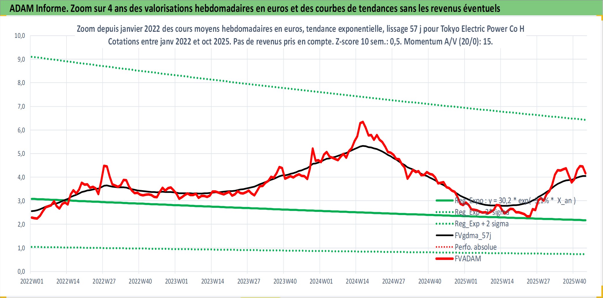 Site dédié aux investisseursPage dédiée sur site financeAnalyse des valorisations hebdomadaires de l'action Tokyo Electric Power Co Holdings Inc. Cet actif est cote en JPY. Les valorisations sont en contrevaleur EURO et couvrent les semaines 1997W01 a 2025W44. Les revenus de cet actif financier sont pris en compte depuis la semaine 2000W13. La note globale ESG de cet actif est estimee a 2.0 (apres rebasage entre 0 et 20).