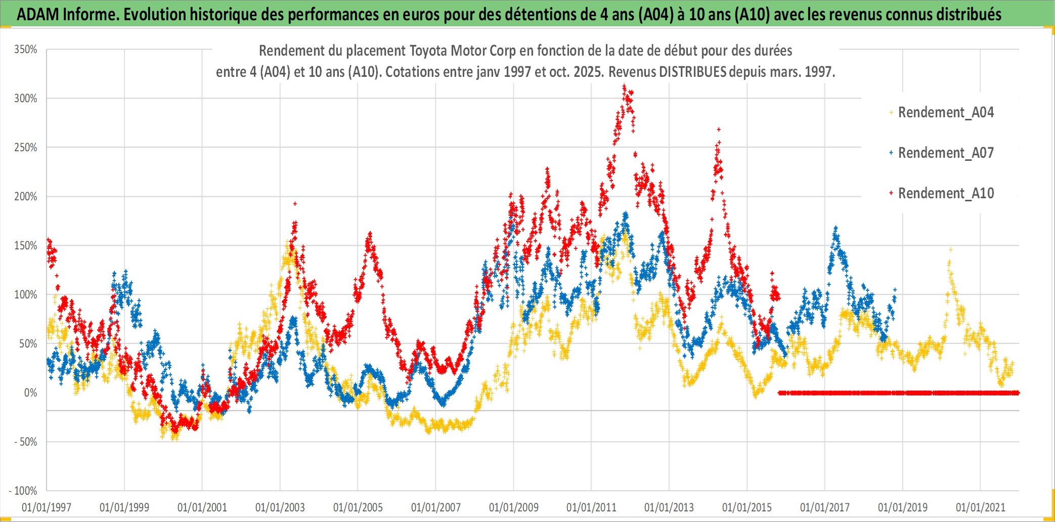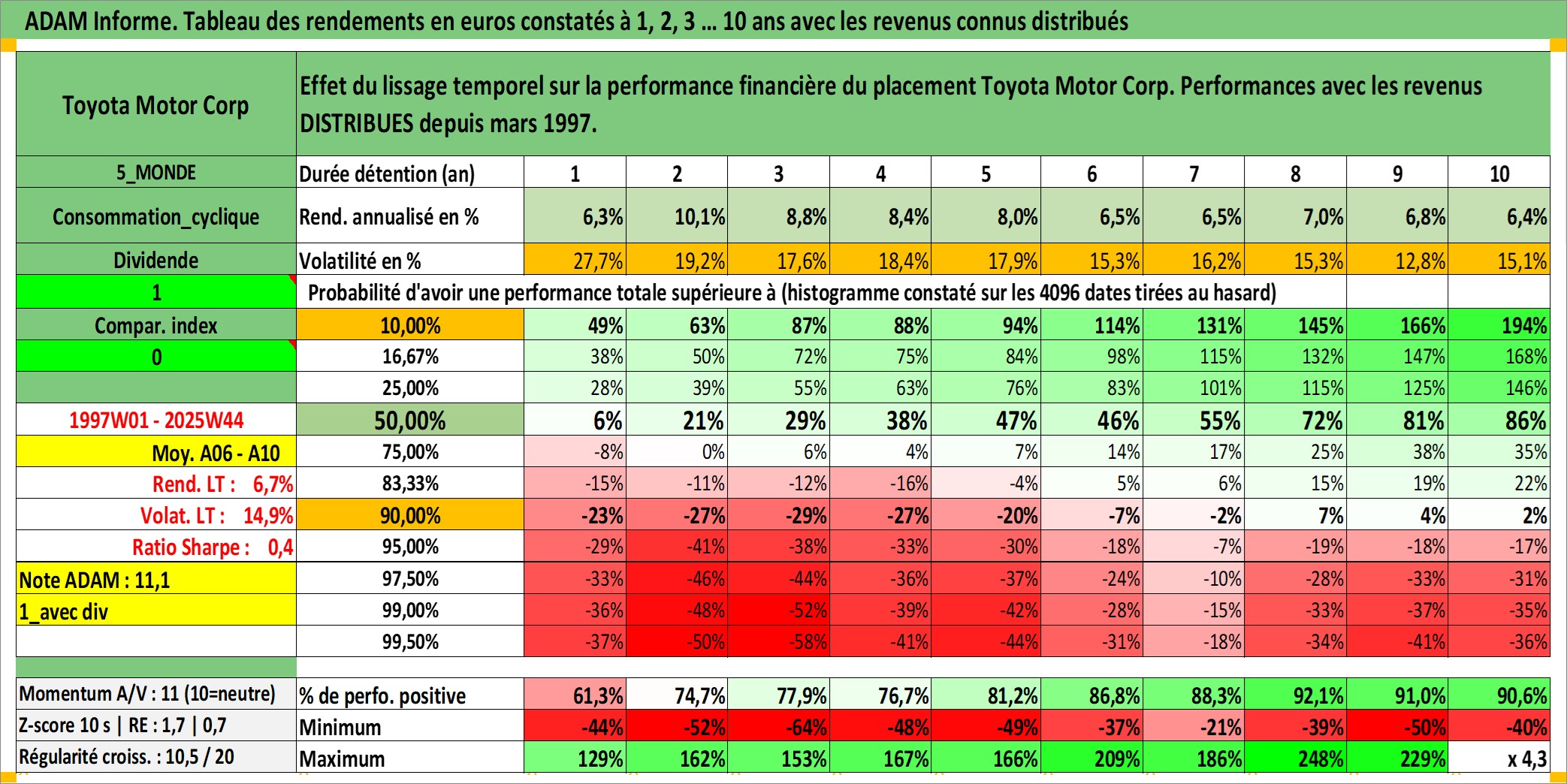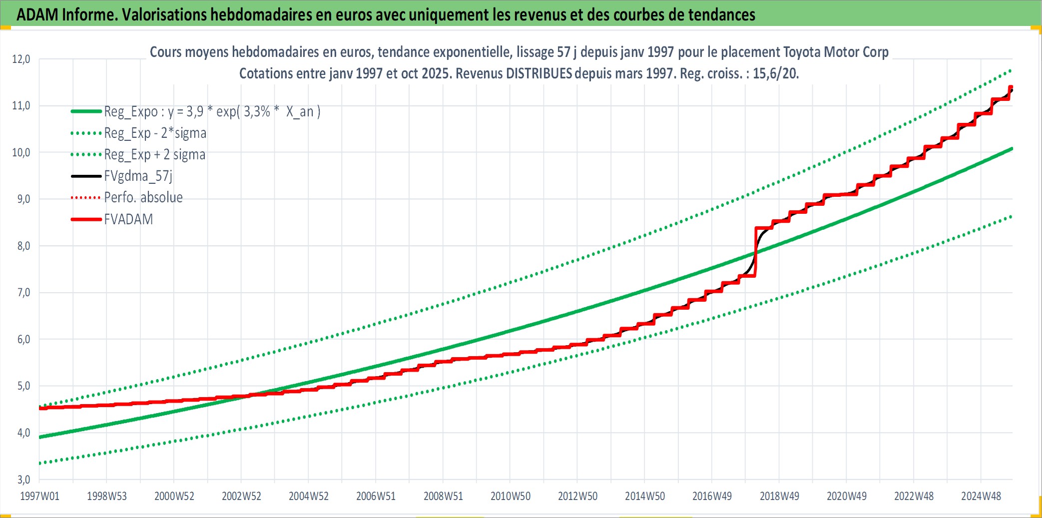 Site dédié aux investisseursPage dédiée sur site financeAnalyse des valorisations hebdomadaires de l'action Toyota Motor Corp. Cet actif est cote en JPY. Les valorisations sont en contrevaleur EURO et couvrent les semaines 1997W01 a 2025W44. Les revenus de cet actif financier sont pris en compte depuis la semaine 1997W13. La note globale ESG de cet actif est estimee a 6.0 (apres rebasage entre 0 et 20).