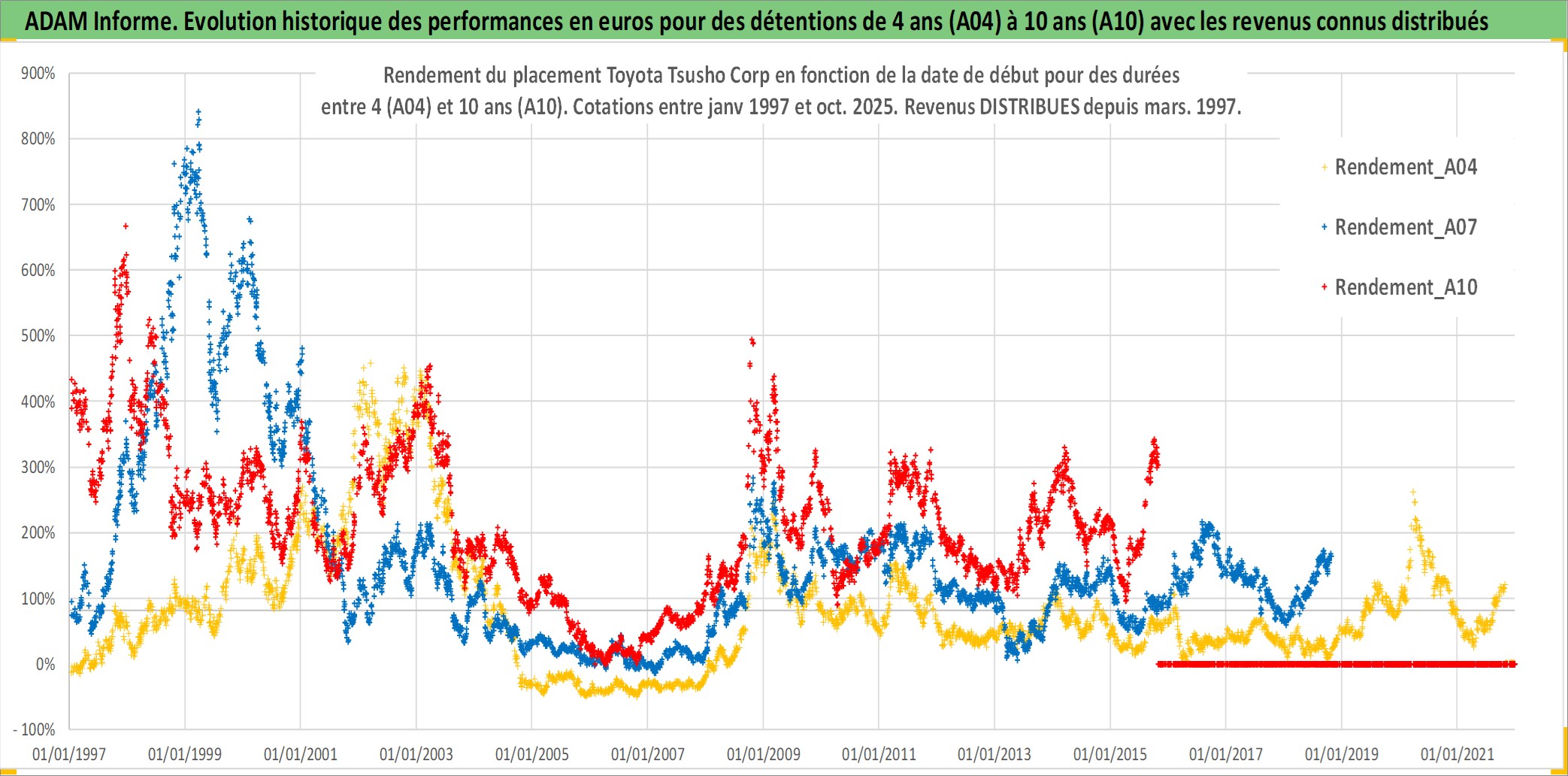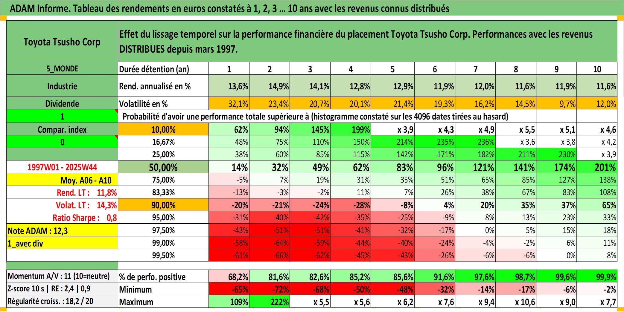 Site dédié aux investisseursPage dédiée sur site financeAnalyse des valorisations hebdomadaires de l'action Toyota Tsusho Corp. Cet actif est cote en JPY. Les valorisations sont en contrevaleur EURO et couvrent les semaines 1997W01 a 2025W44. Les revenus de cet actif financier sont pris en compte depuis la semaine 1997W13. La note globale ESG de cet actif est estimee a 8.0 (apres rebasage entre 0 et 20).