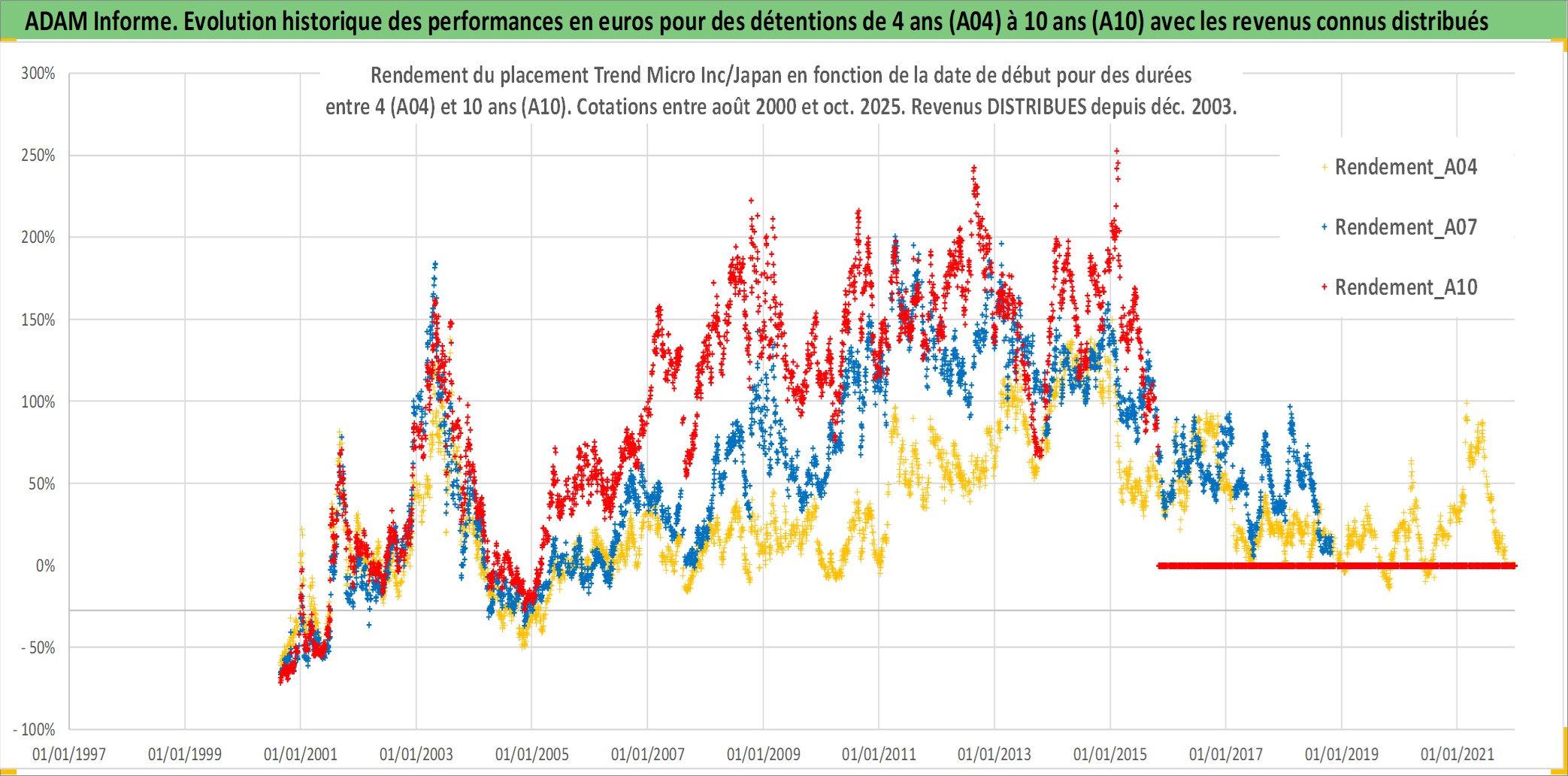 Site dédié aux investisseursPage dédiée sur site financeAnalyse des valorisations hebdomadaires de l'action Trend Micro Inc/Japan. Cet actif est cote en JPY. Les valorisations sont en contrevaleur EURO et couvrent les semaines 2000W33 a 2025W44. Les revenus de cet actif financier sont pris en compte depuis la semaine 2003W52. La note globale ESG de cet actif est estimee a 9.0 (apres rebasage entre 0 et 20).