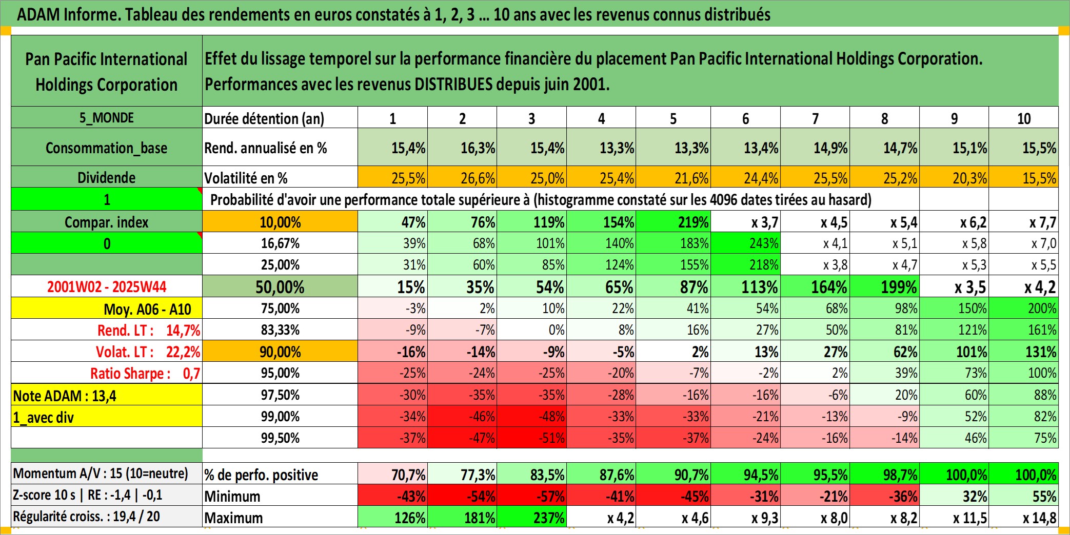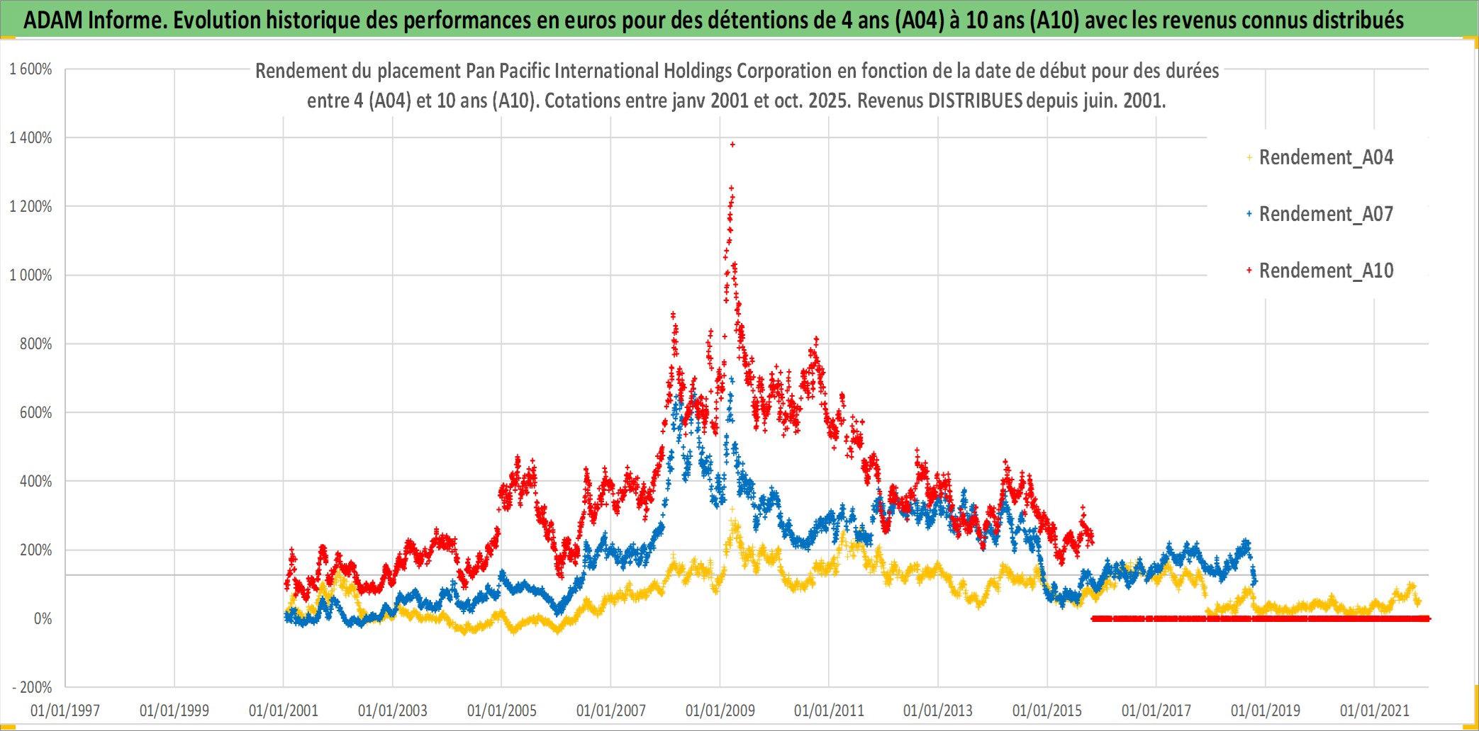Site dédié aux investisseursPage dédiée sur site financeAnalyse des valorisations hebdomadaires de l'action Pan Pacific International Holdings Corporation. Cet actif est cote en JPY. Les valorisations sont en contrevaleur EURO et couvrent les semaines 2001W02 a 2025W44. Les revenus de cet actif financier sont pris en compte depuis la semaine 2001W26. La note globale ESG de cet actif est estimee a 11.0 (apres rebasage entre 0 et 20).