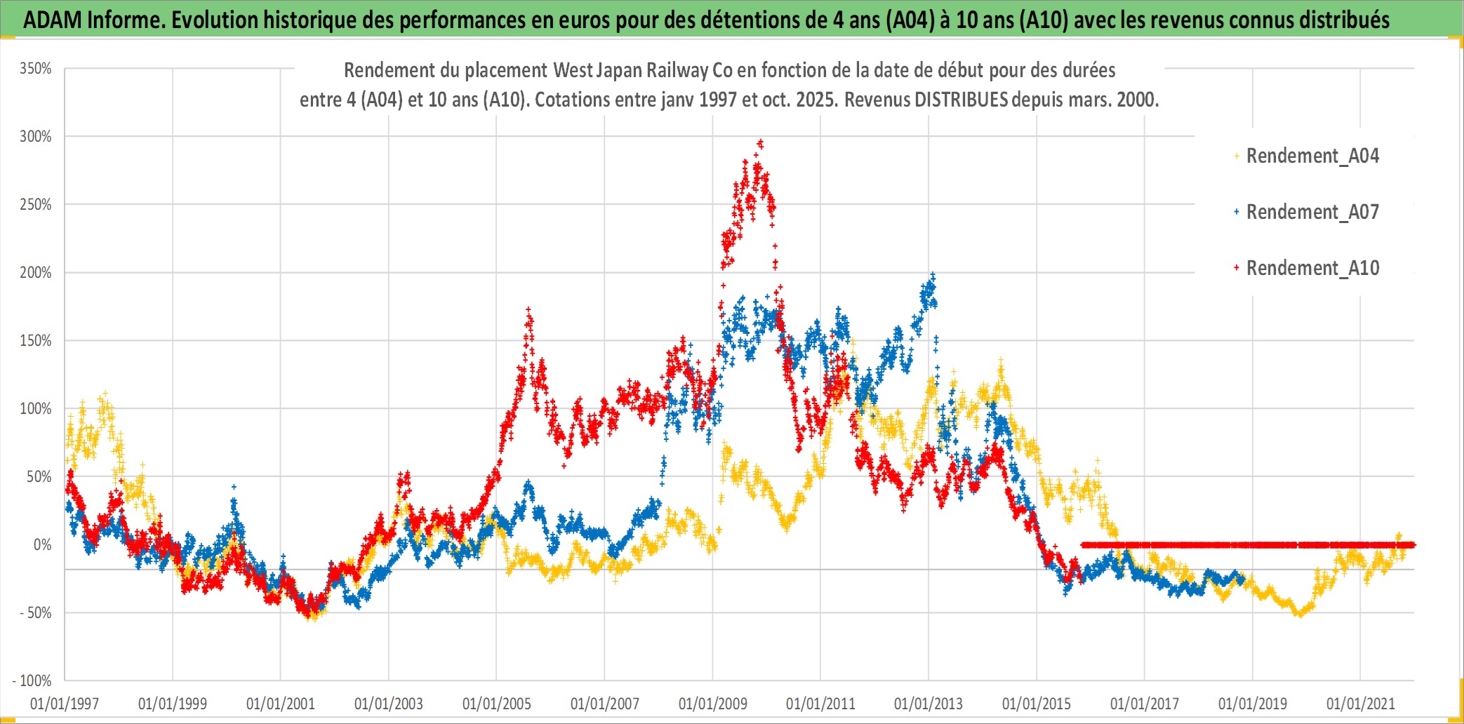 Site dédié aux investisseursPage dédiée sur site financeAnalyse des valorisations hebdomadaires de l'action West Japan Railway Co. Cet actif est cote en JPY. Les valorisations sont en contrevaleur EURO et couvrent les semaines 1997W01 a 2025W44. Les revenus de cet actif financier sont pris en compte depuis la semaine 2000W13. La note globale ESG de cet actif est estimee a 7.0 (apres rebasage entre 0 et 20).