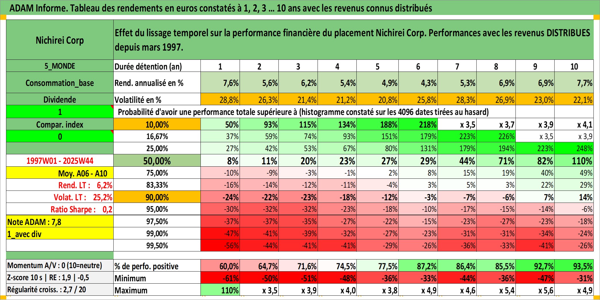 Site dédié aux investisseursPage dédiée sur site financeAnalyse des valorisations hebdomadaires de l'action Nichirei Corp. Cet actif est cote en JPY. Les valorisations sont en contrevaleur EURO et couvrent les semaines 1997W01 a 2025W44. Les revenus de cet actif financier sont pris en compte depuis la semaine 1997W13. La note ESG de cet actif n'est pas connue.