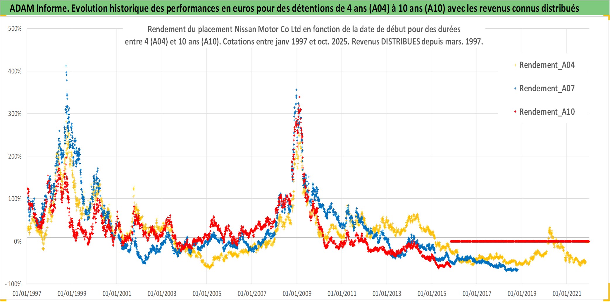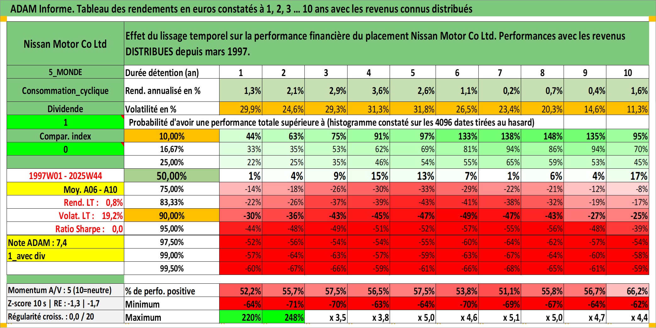 Site dédié aux investisseursPage dédiée sur site financeAnalyse des valorisations hebdomadaires de l'action Nissan Motor Co Ltd. Cet actif est cote en JPY. Les valorisations sont en contrevaleur EURO et couvrent les semaines 1997W01 a 2025W44. Les revenus de cet actif financier sont pris en compte depuis la semaine 1997W13. La note globale ESG de cet actif est estimee a 4.0 (apres rebasage entre 0 et 20).